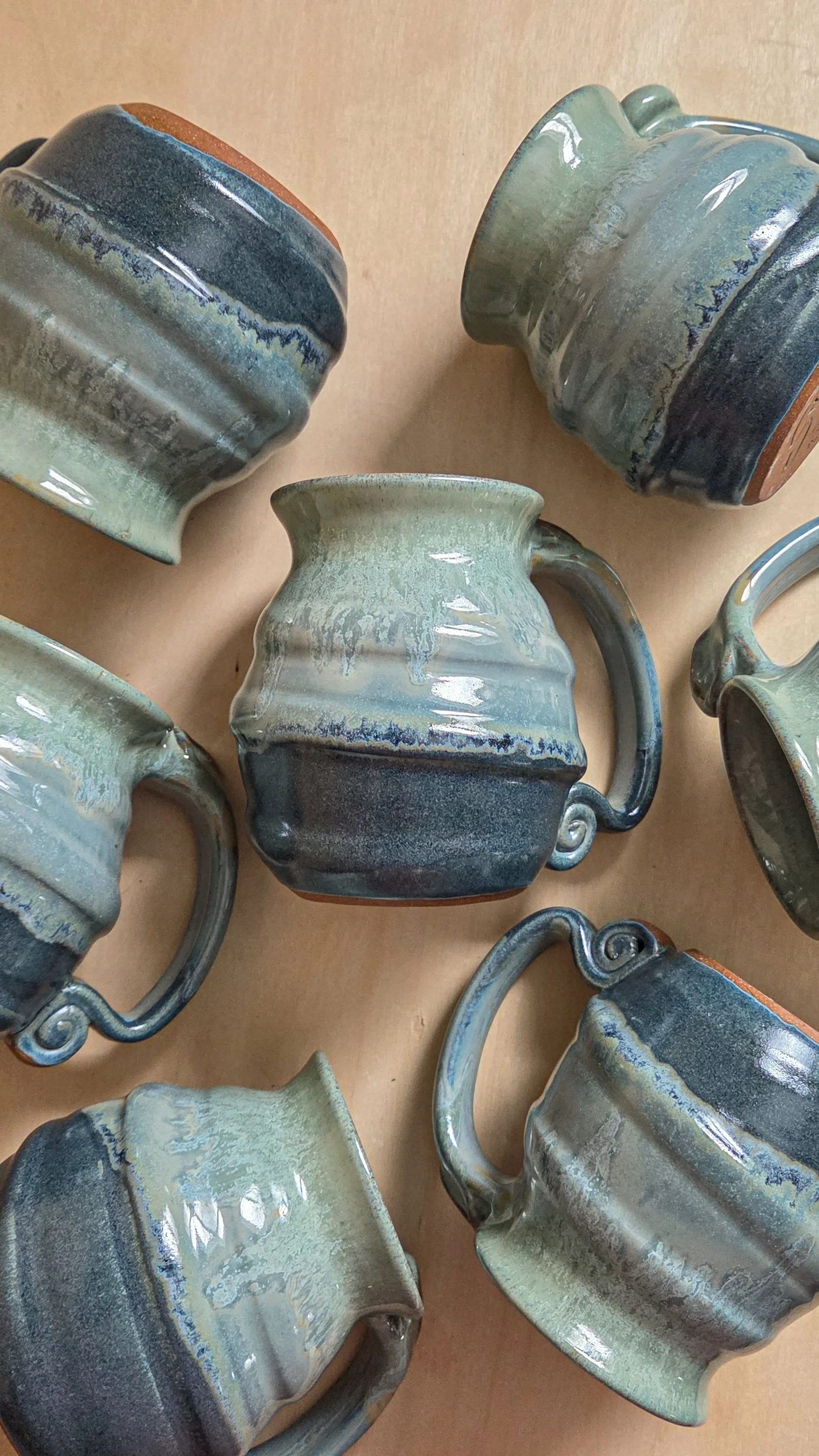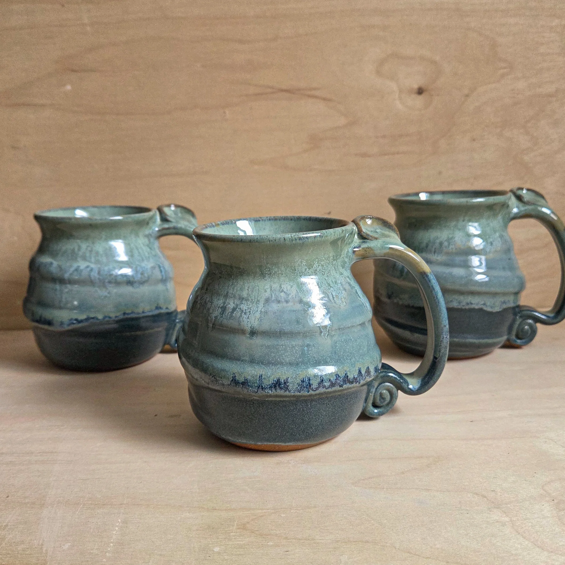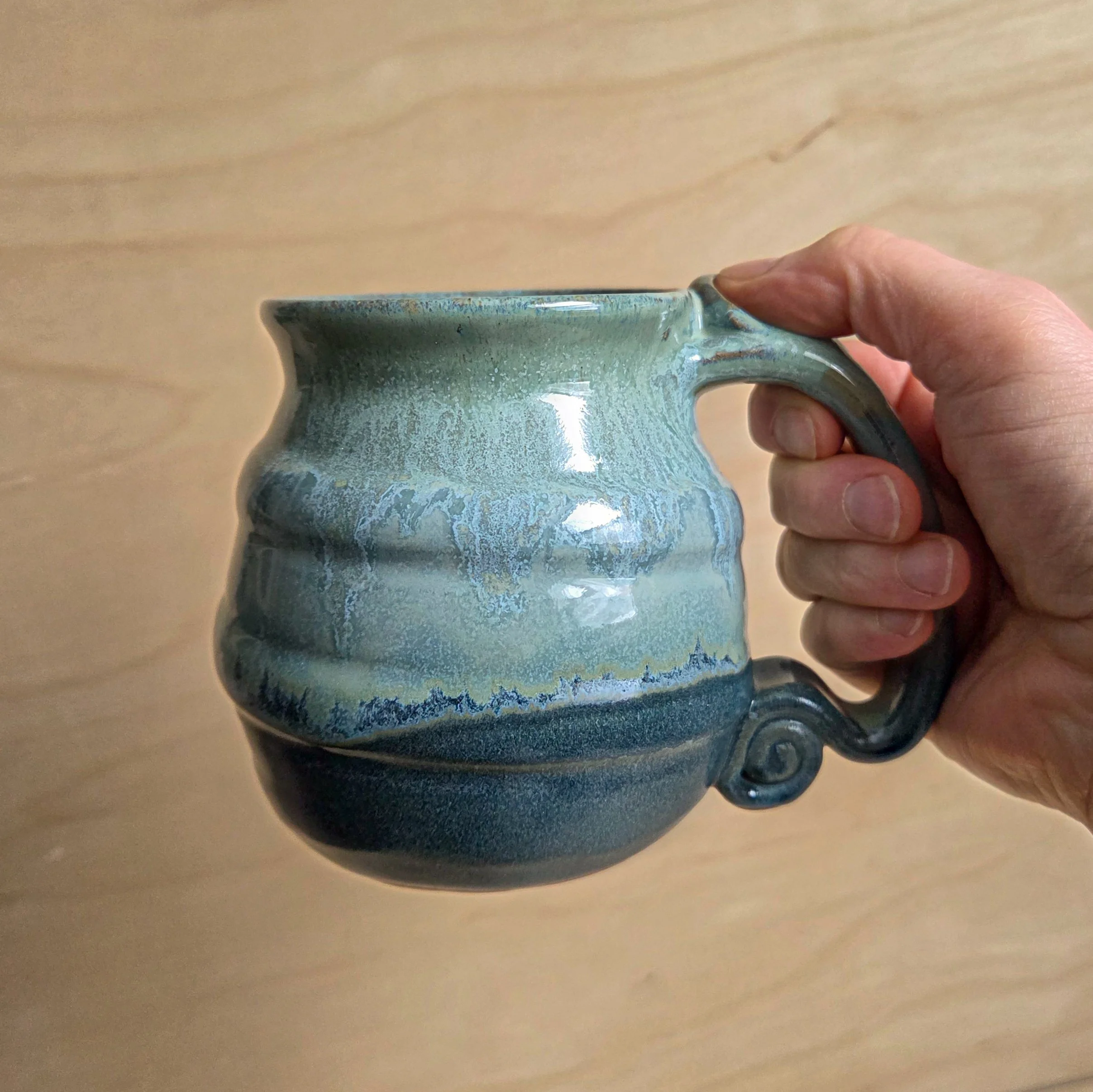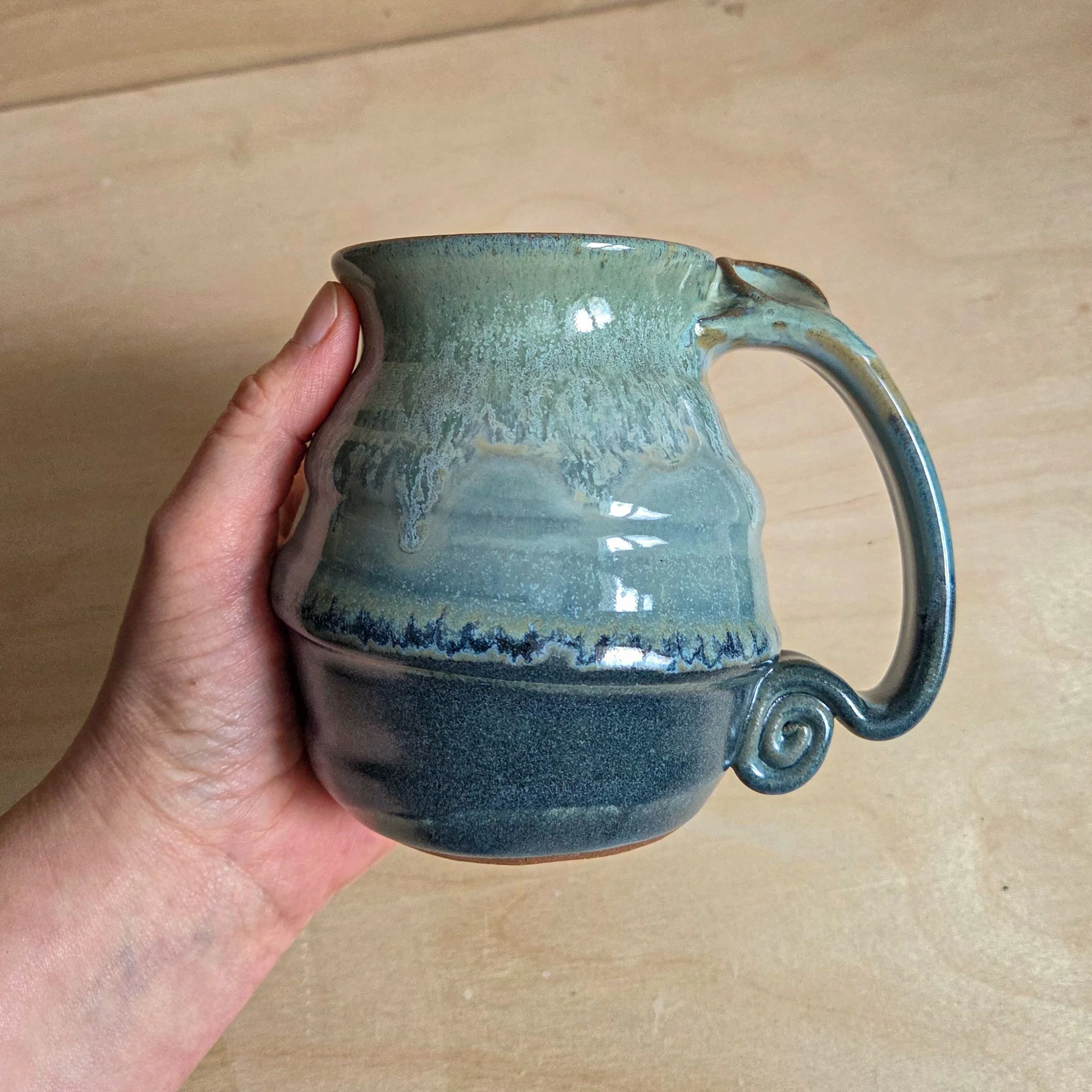 A right hand mug (an ergonomic thumb rest, slanted to fit your right hand) and a large, comfortable handle. Made from dark red stoneware clay, this mug is moody and deep!