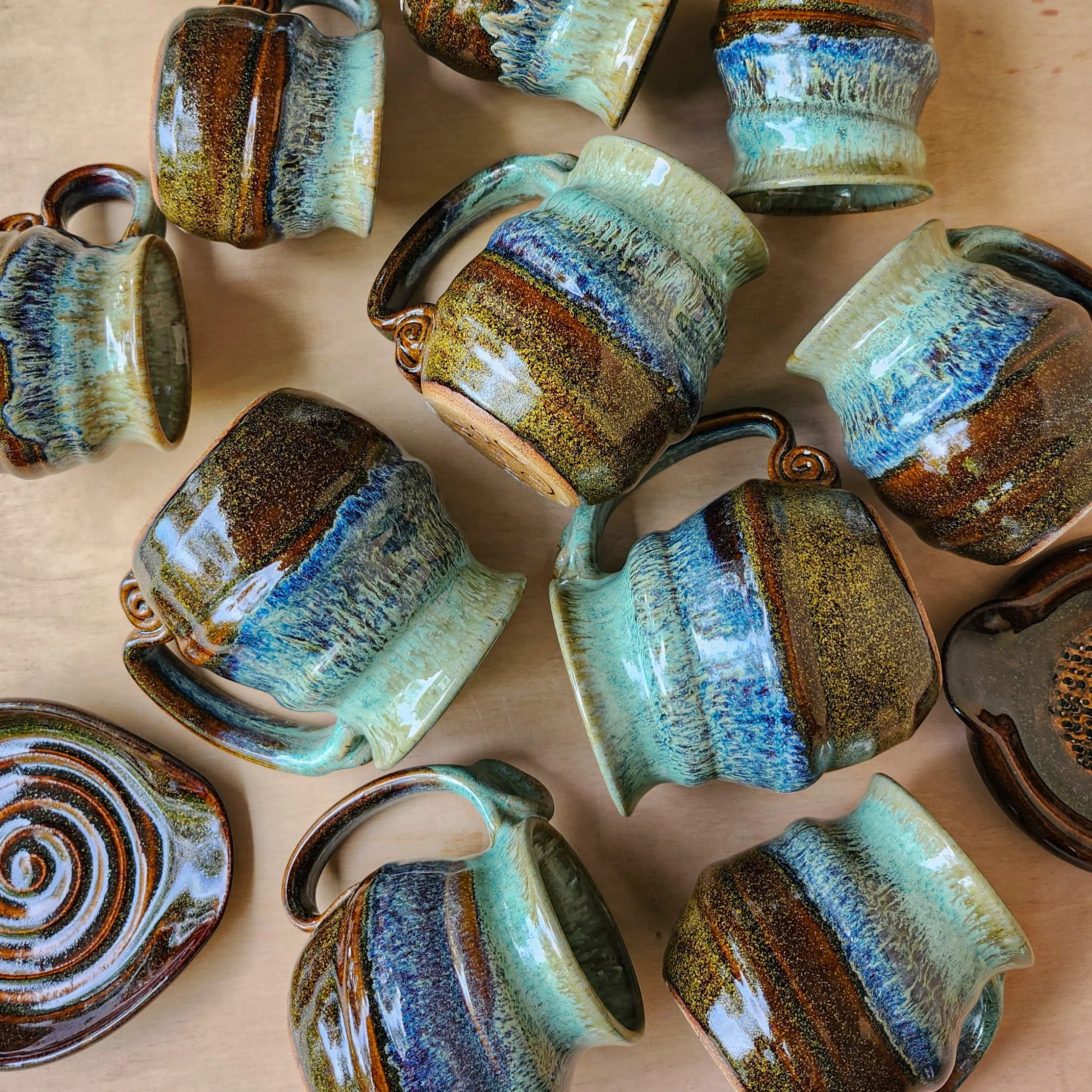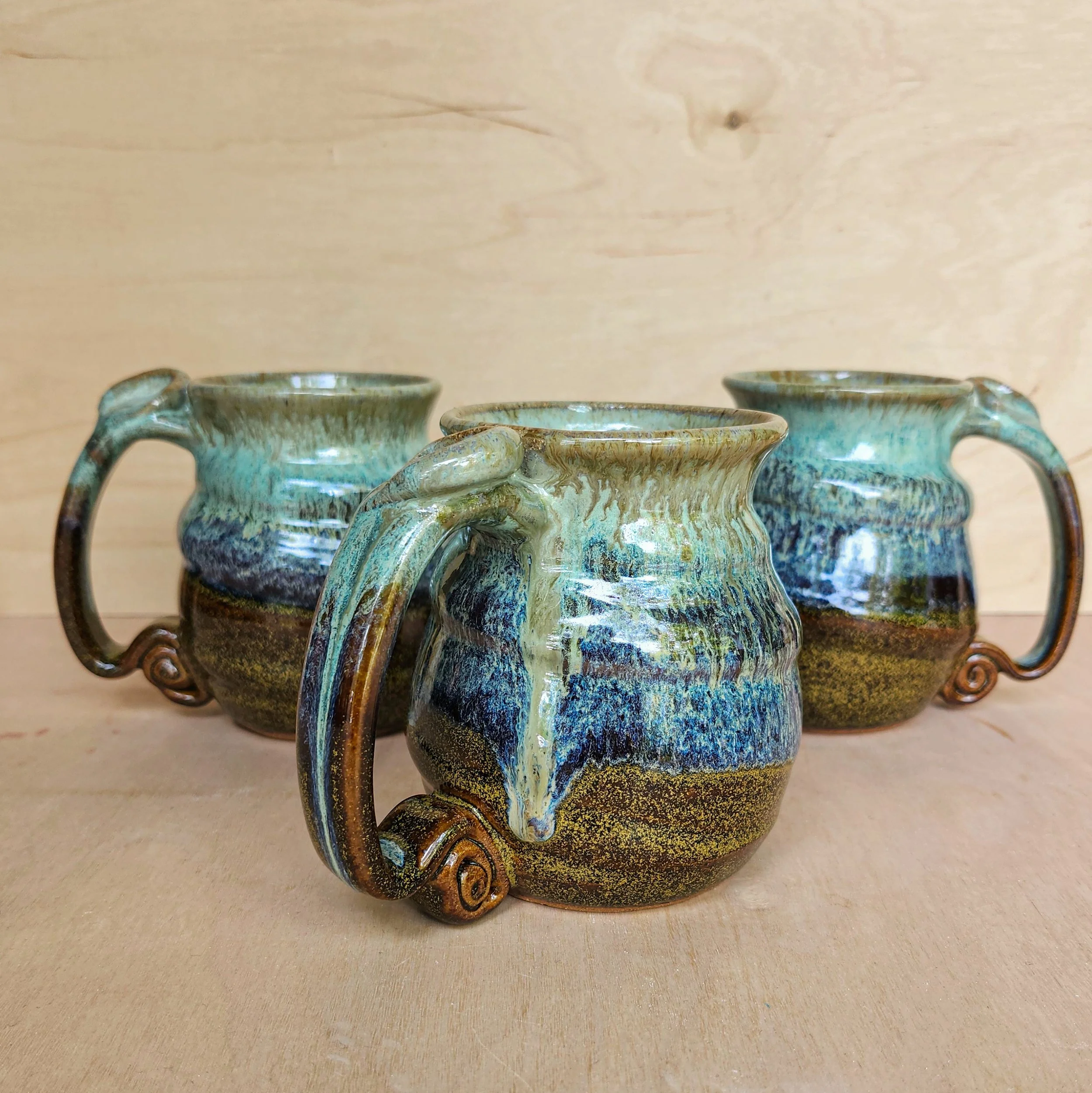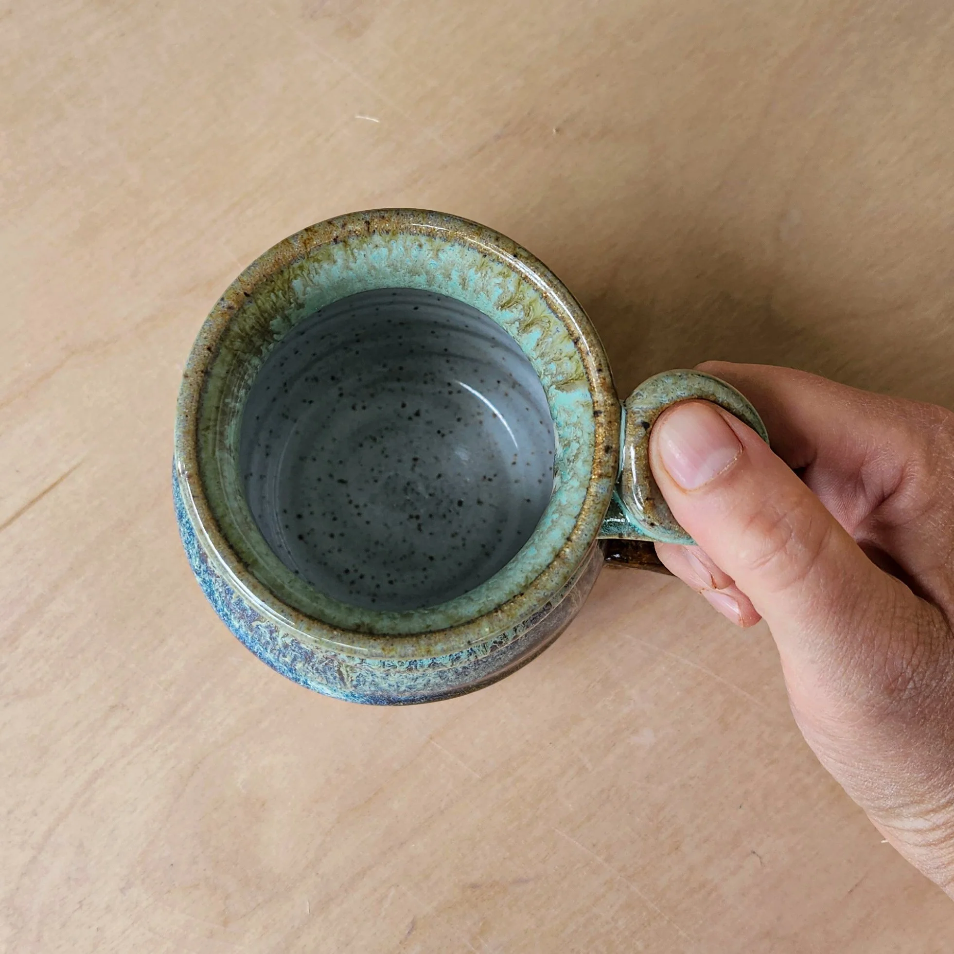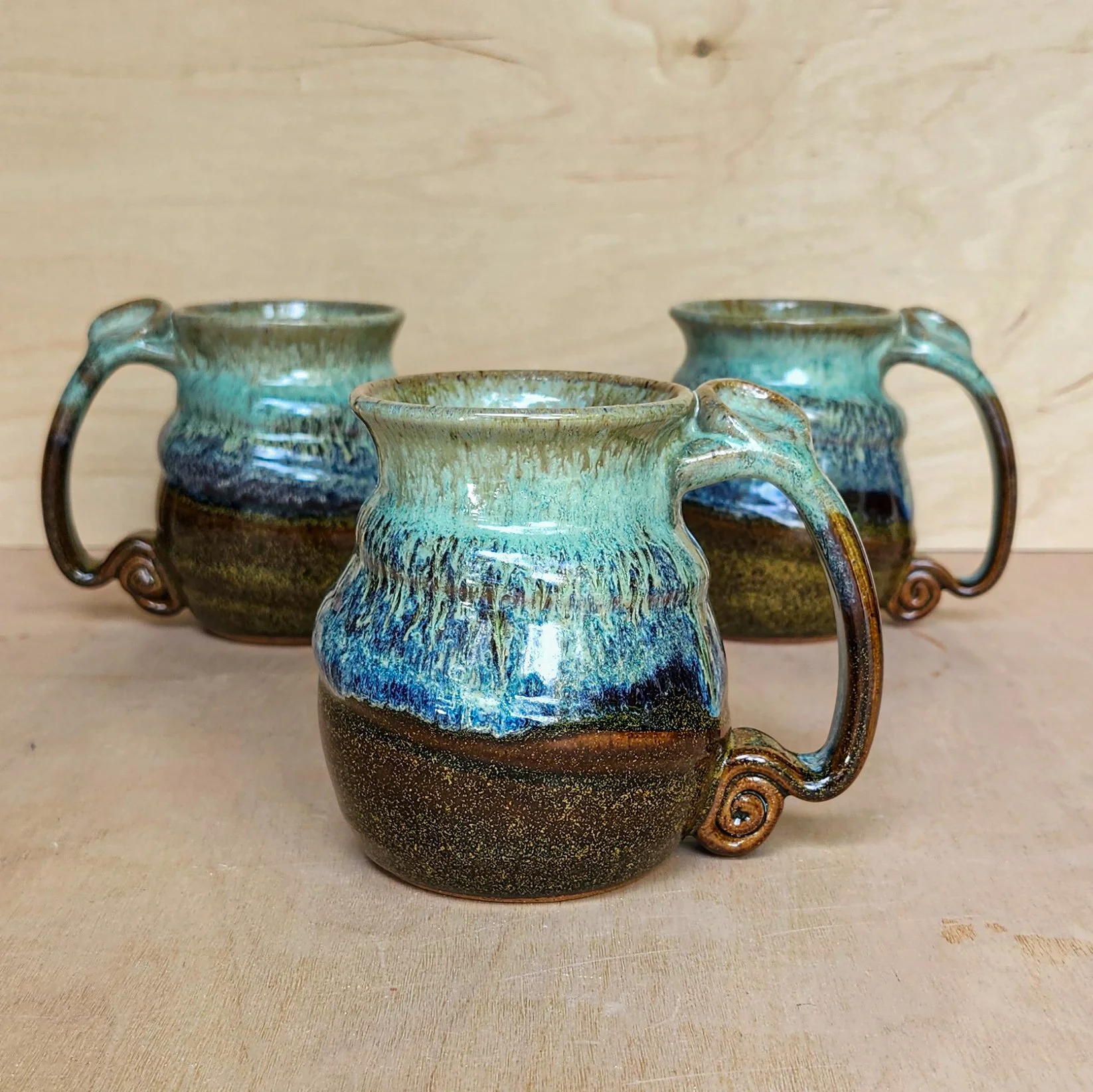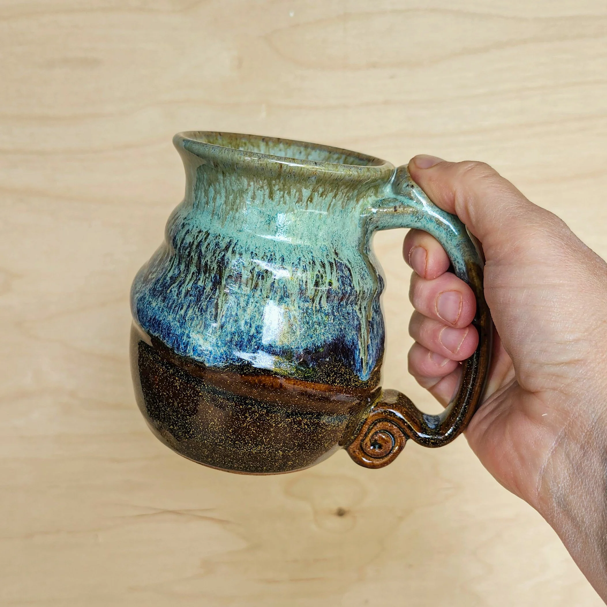 A large mug holding about 500mls of liquid bliss. A large right hand thumb rest with a large handle. The brown glaze around the bottom has gold flakes in it. Each mug’s drips are unique. Mint green glaze drips around the top with some hints of bioluminescence in between!