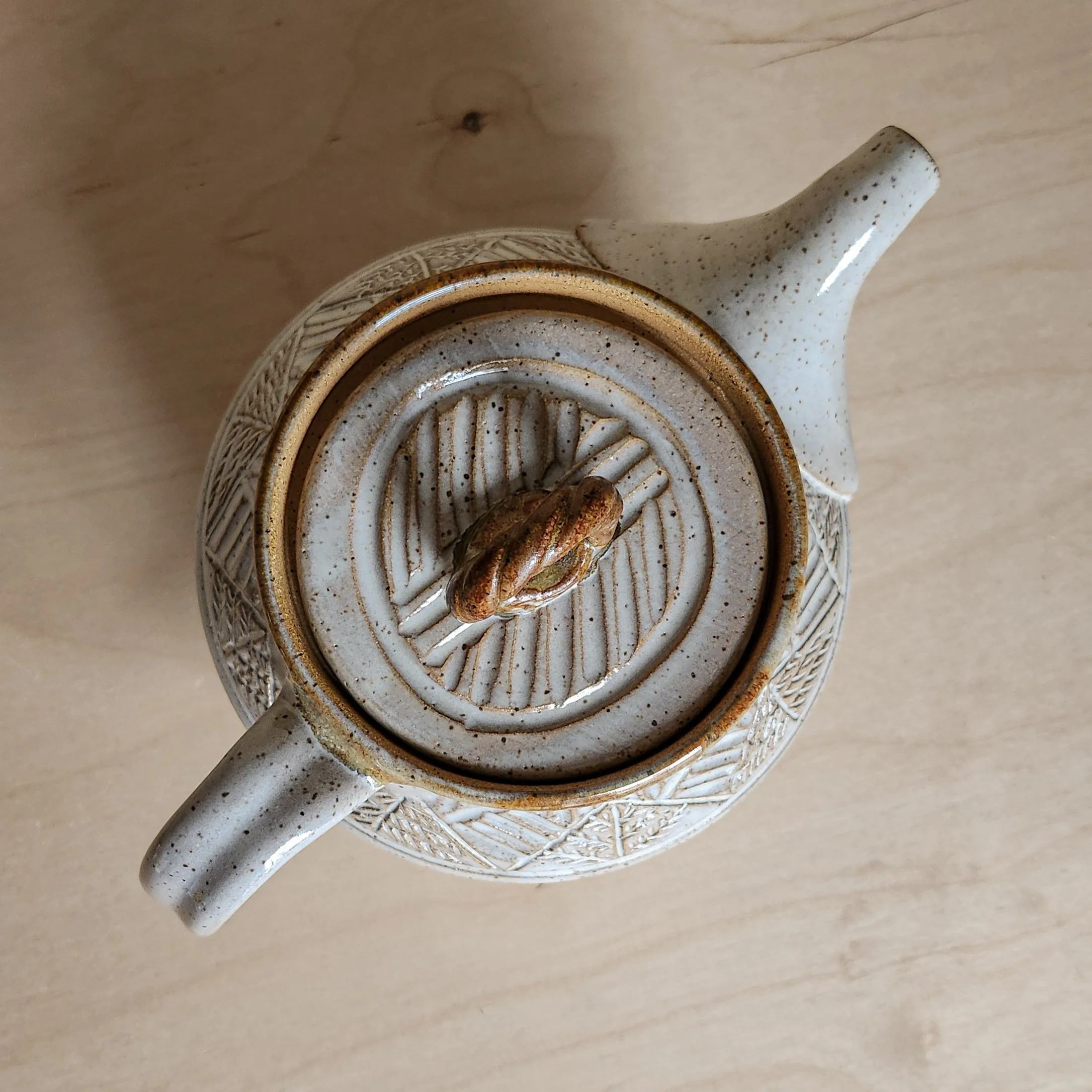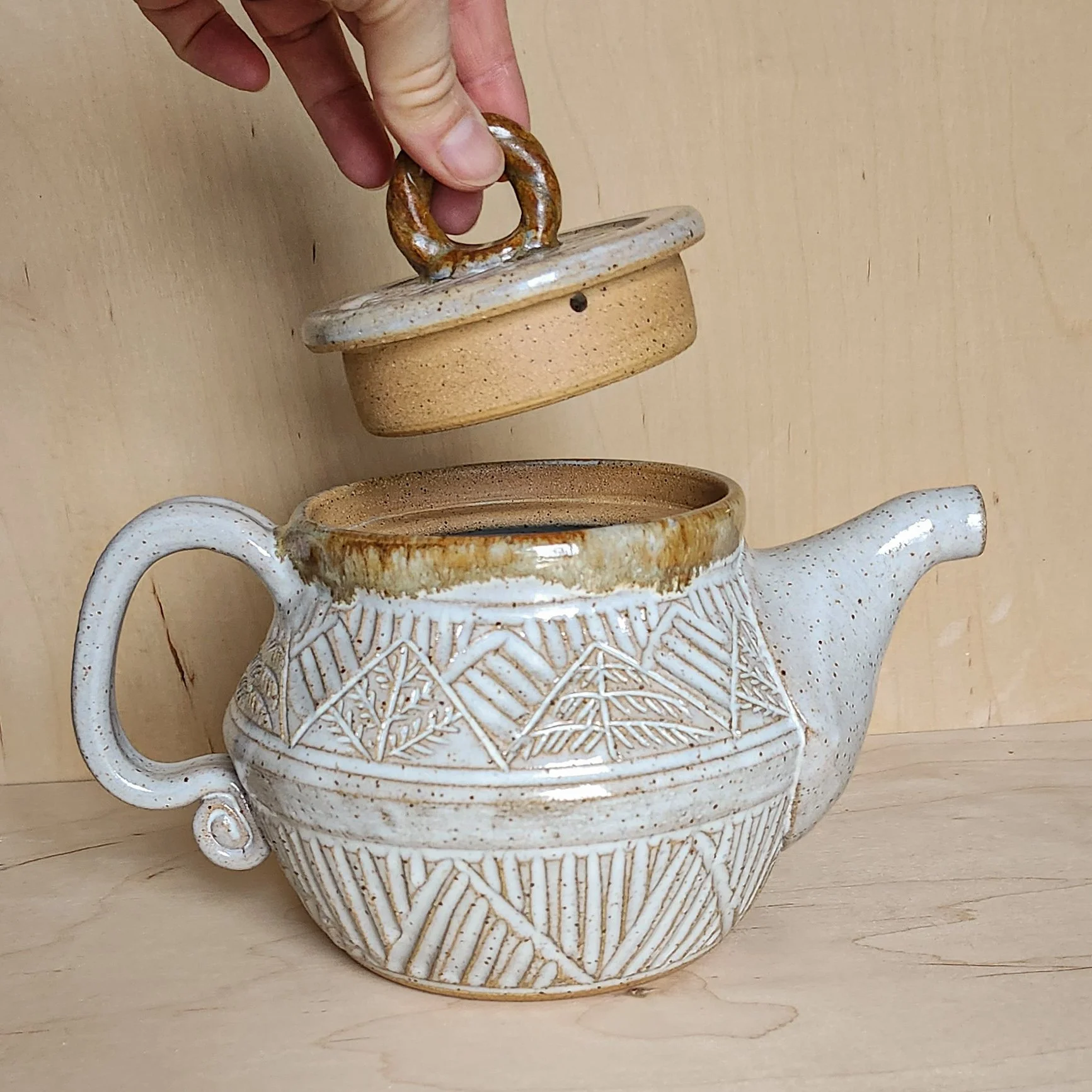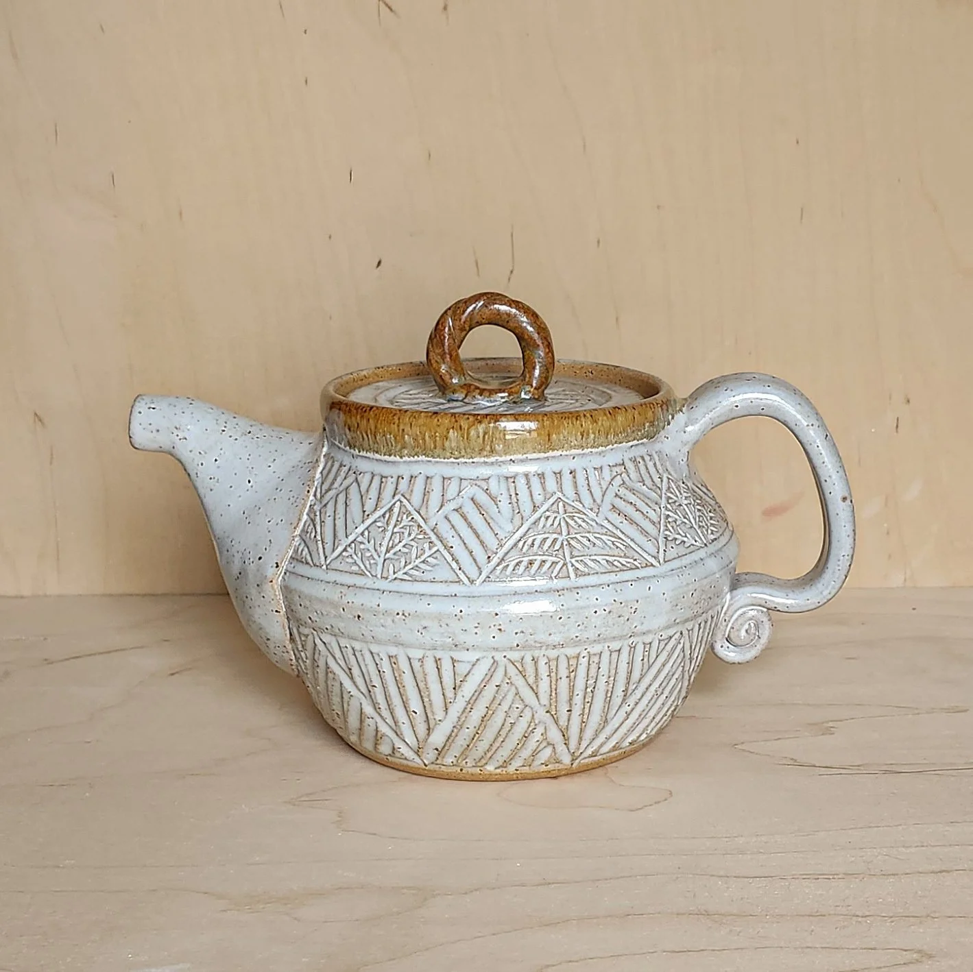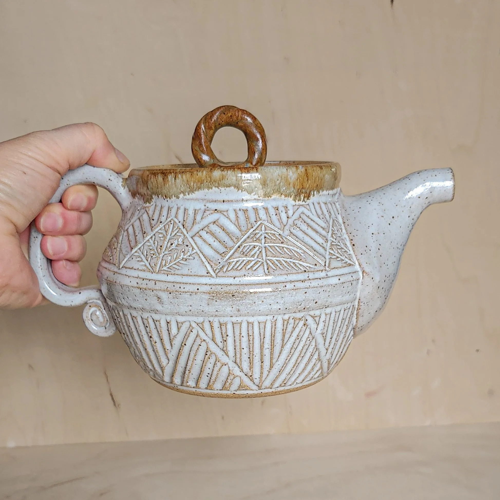 A teapot that holds 1200mls of liquid. A beautiful pour! Hand carved texture of trees and mountains around the sides of the pot. A beautiful, functional piece of art!