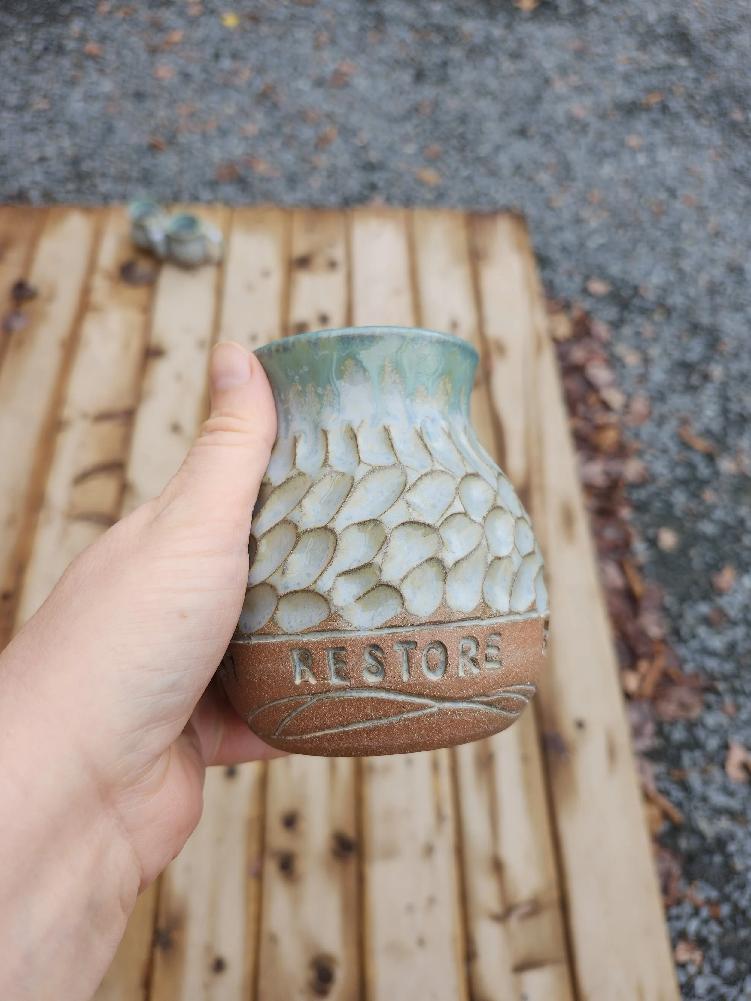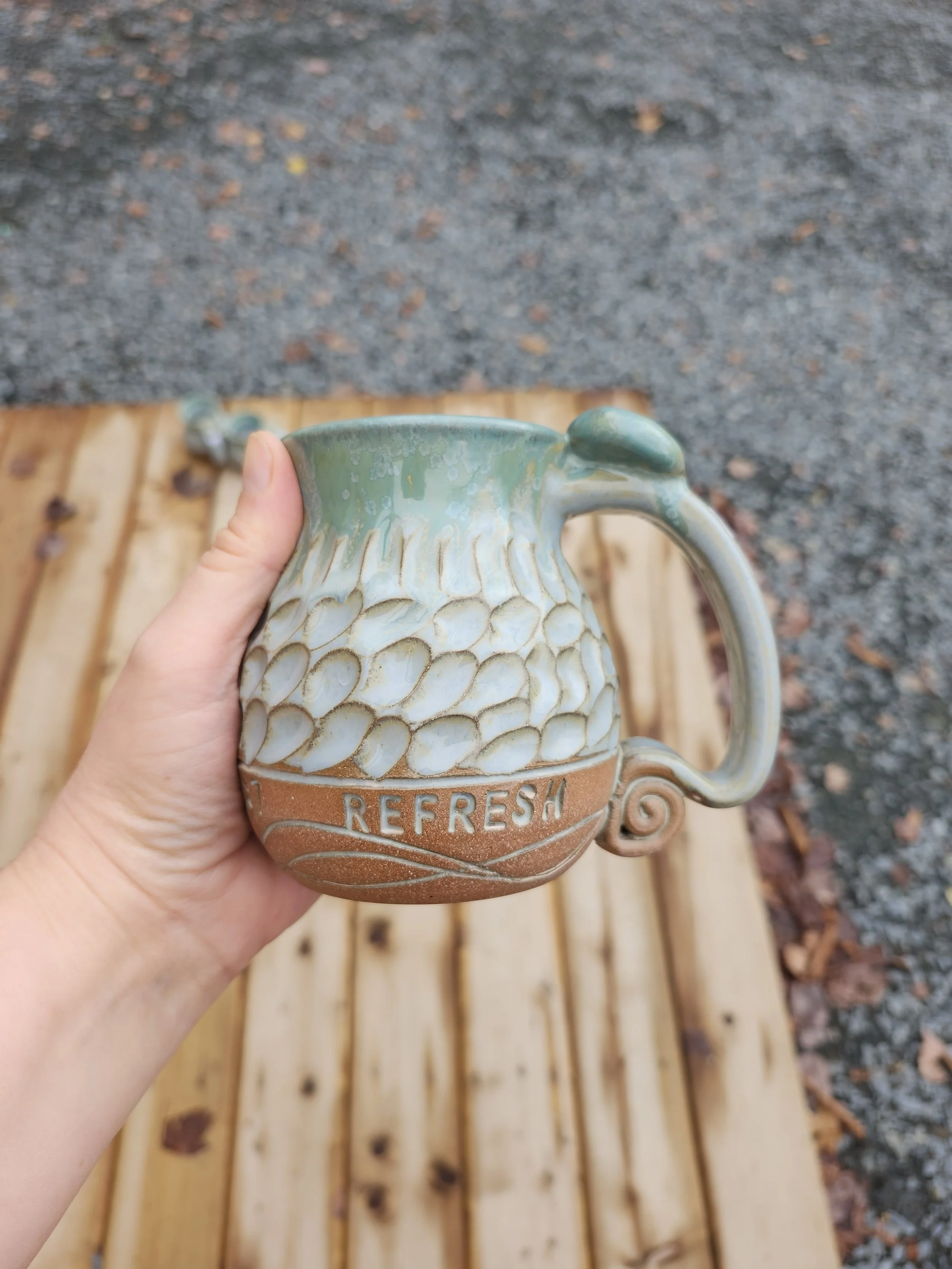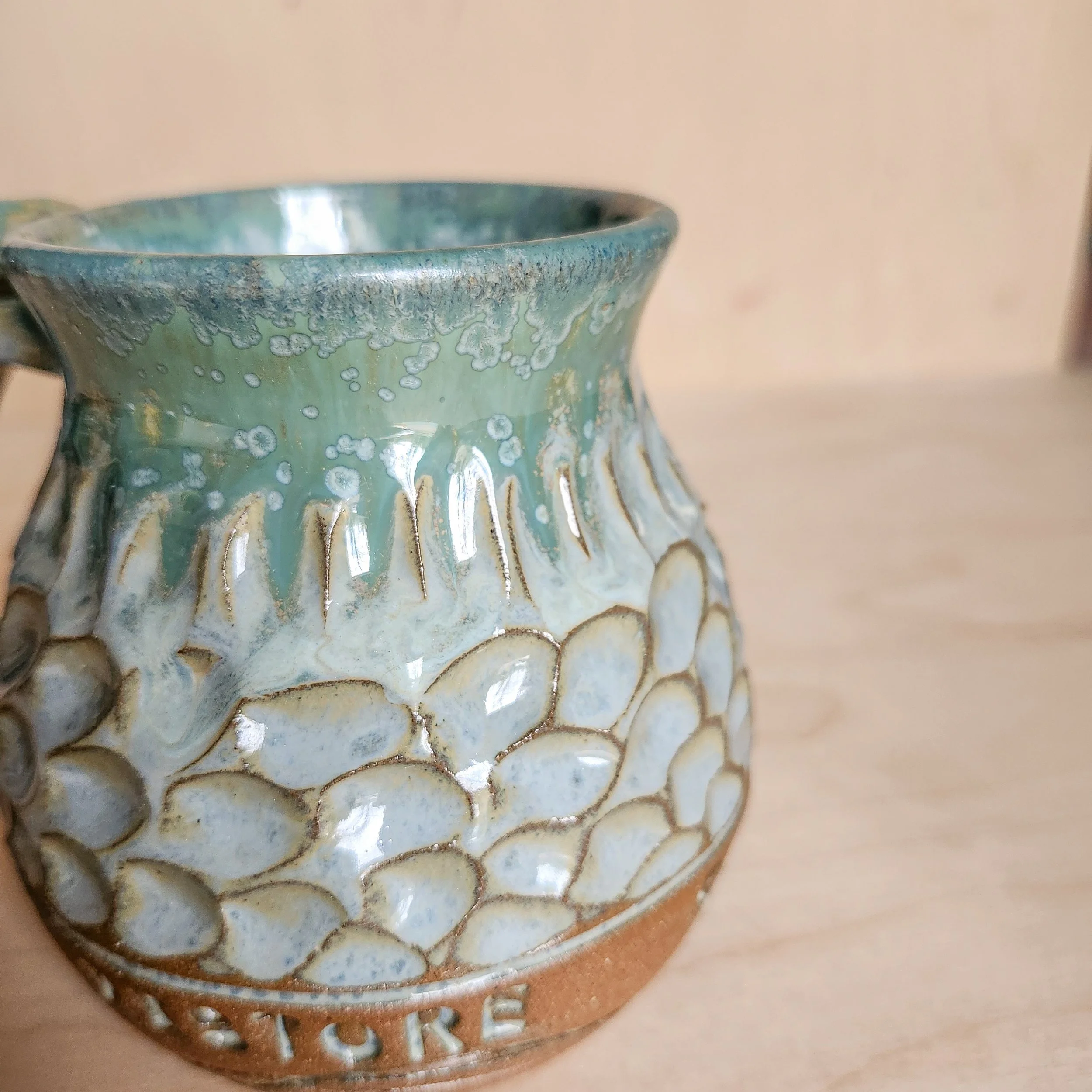 A large mug holding about 480-500mls of liquid bliss. A left hand thumb rest for all the lefties in the pottery loving world. Words stamped around the middle are rest, restore, rest, refresh.