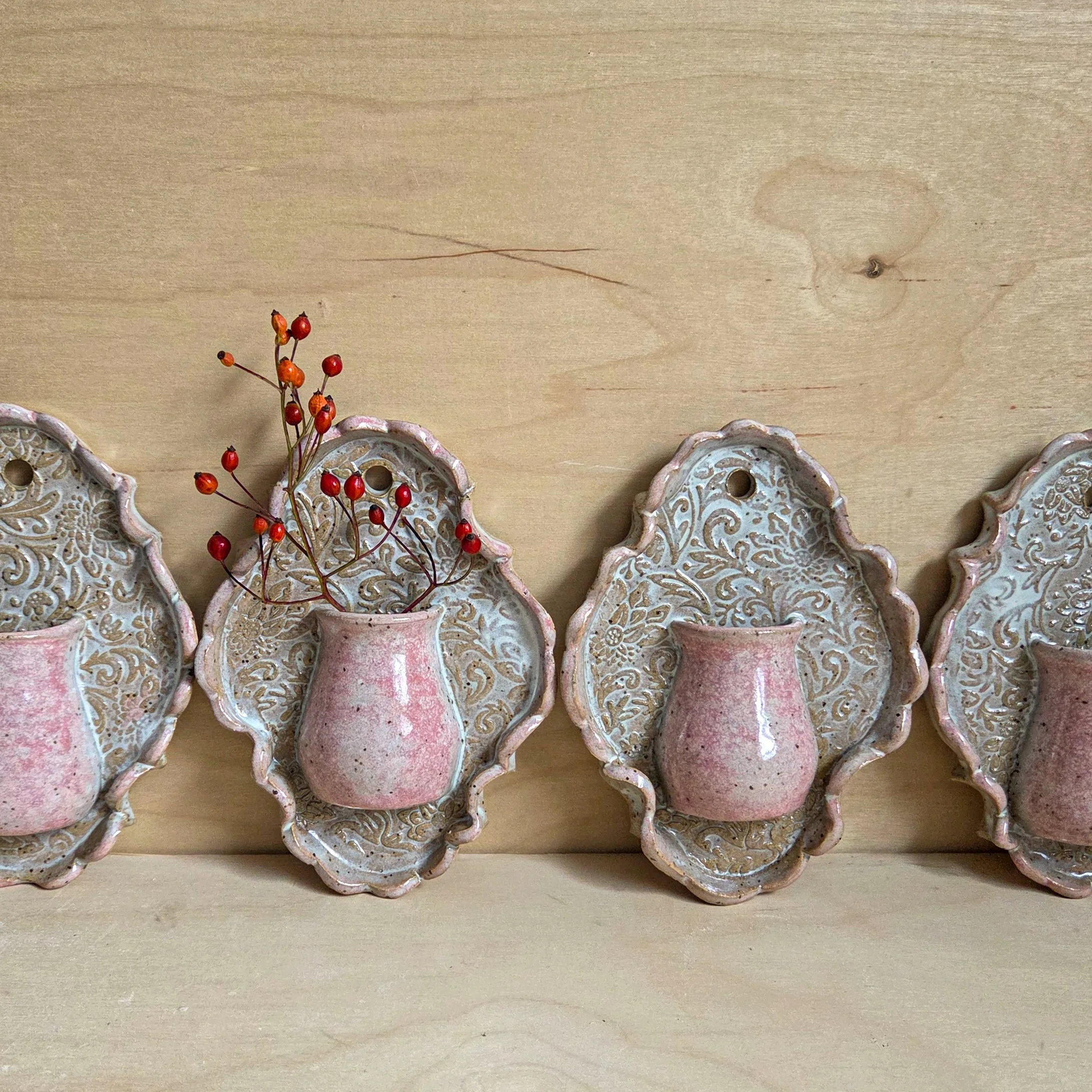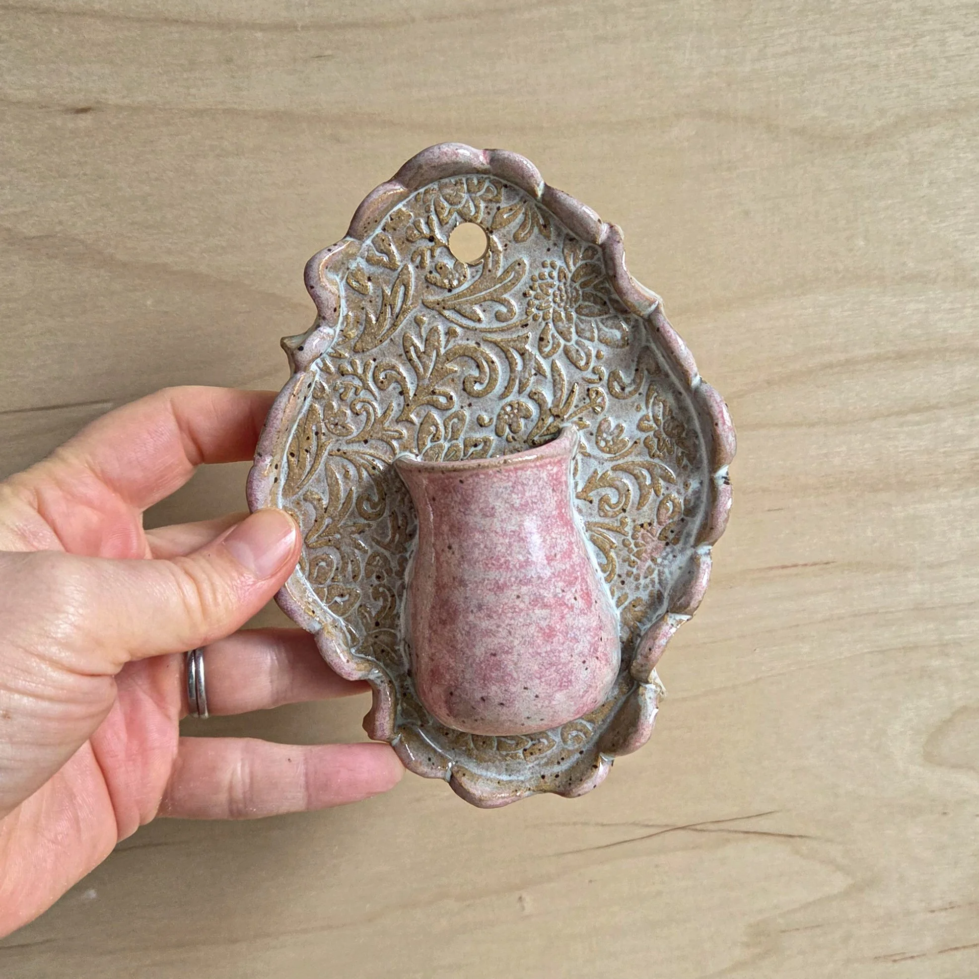 A sweet vase that can hang on a finishing nail (yes, it's that light). Perfect to add some love to any little spot on your wall! 5.5 inches long, this vase holds water and is perfect for little spring wildflowers.