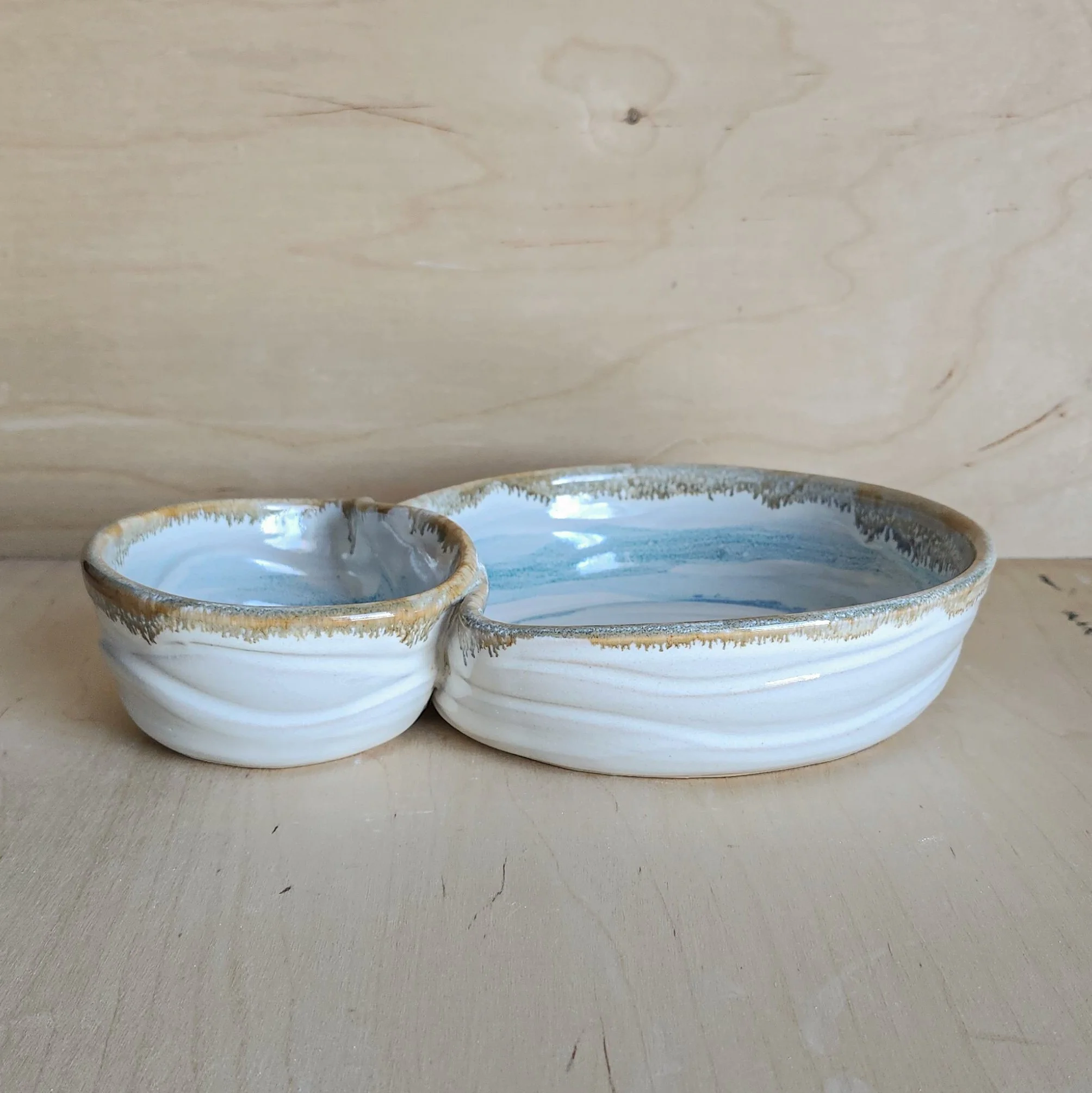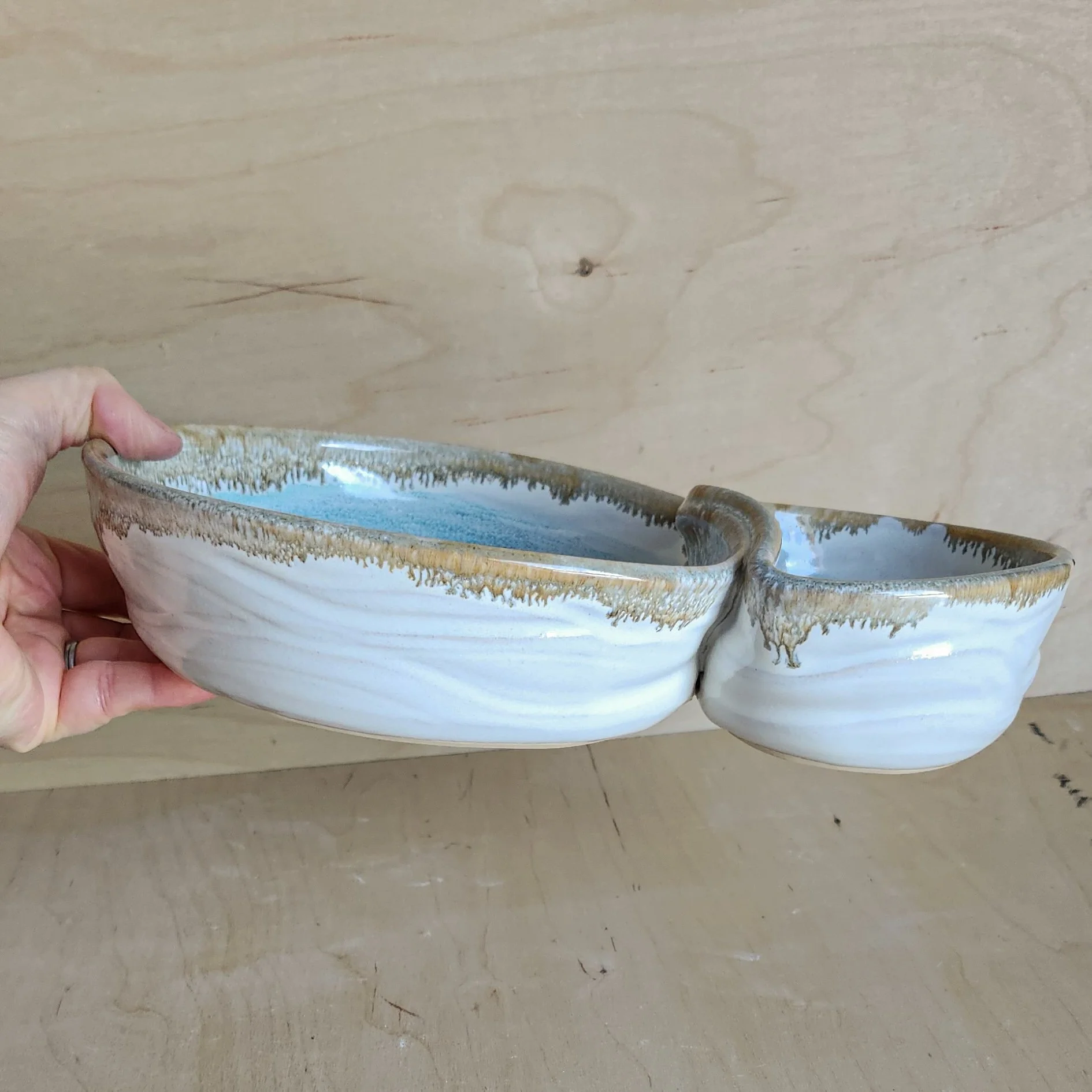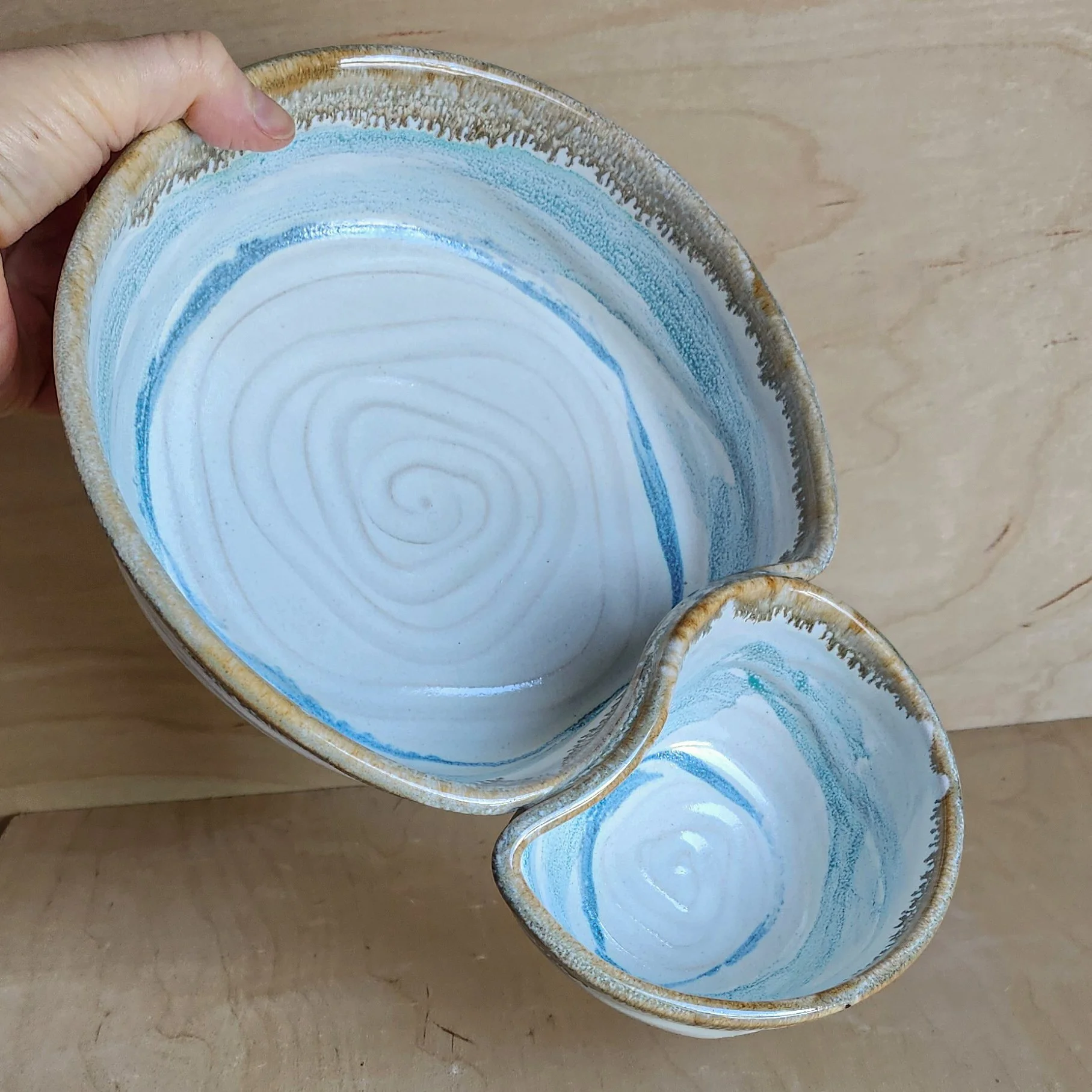 A Bowl with attached dip bowl. 11 inches long, including both bowls, 8 inches wide. Hold it on your lap for movie night or place it on the table for a dinner party!