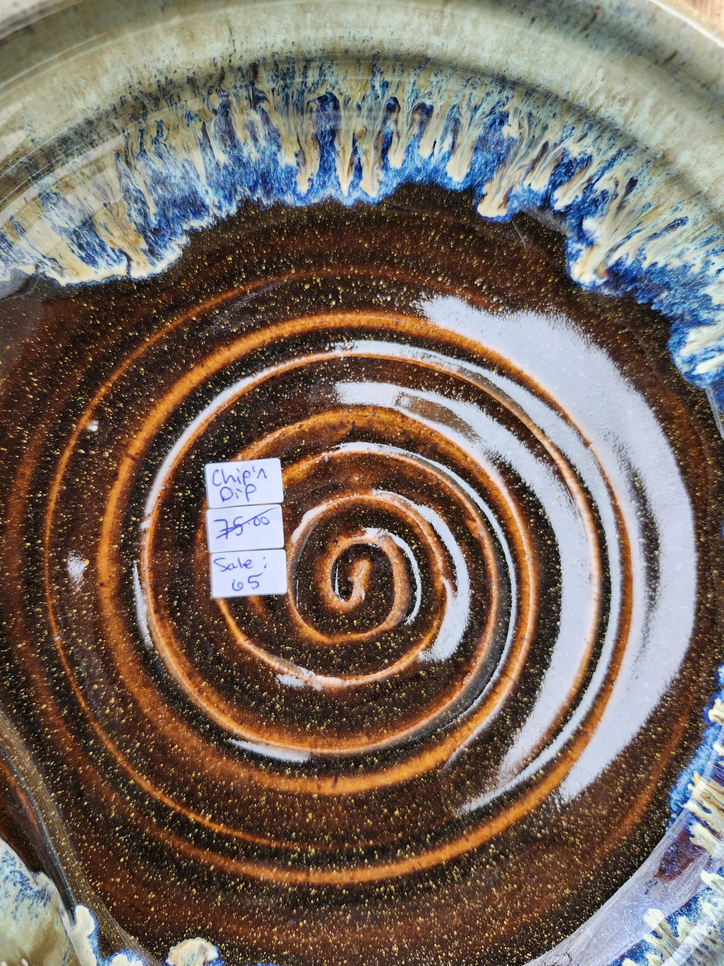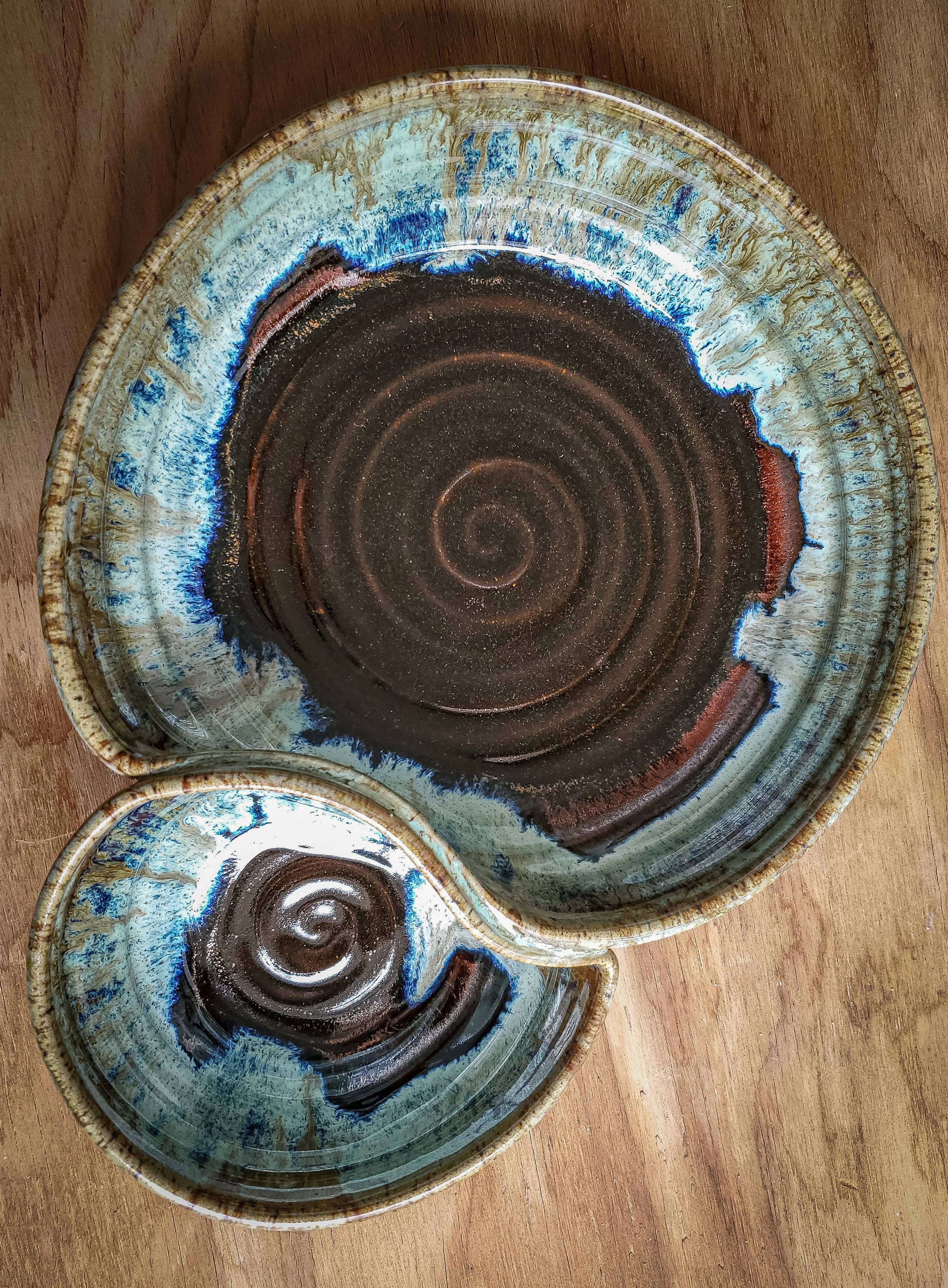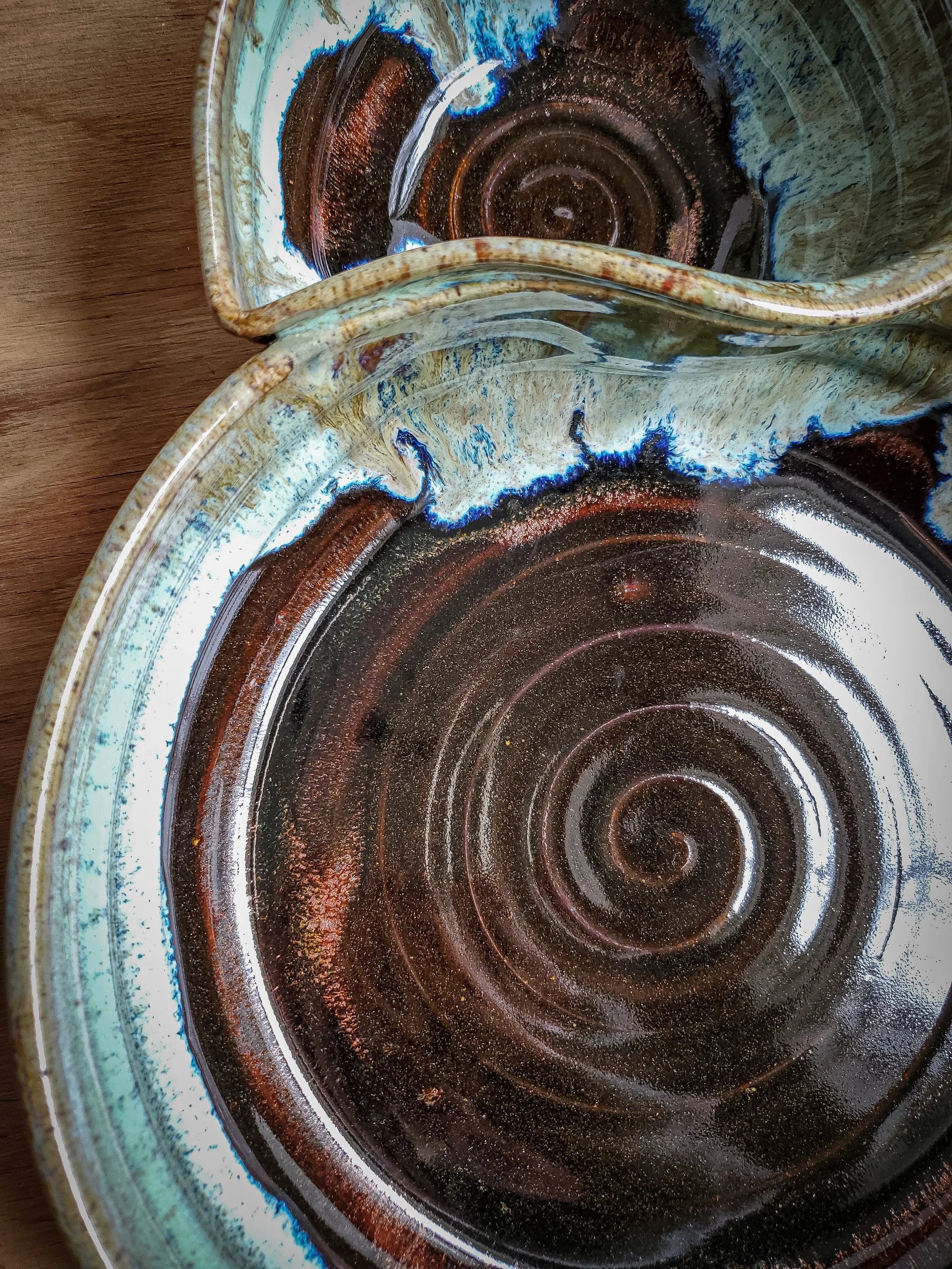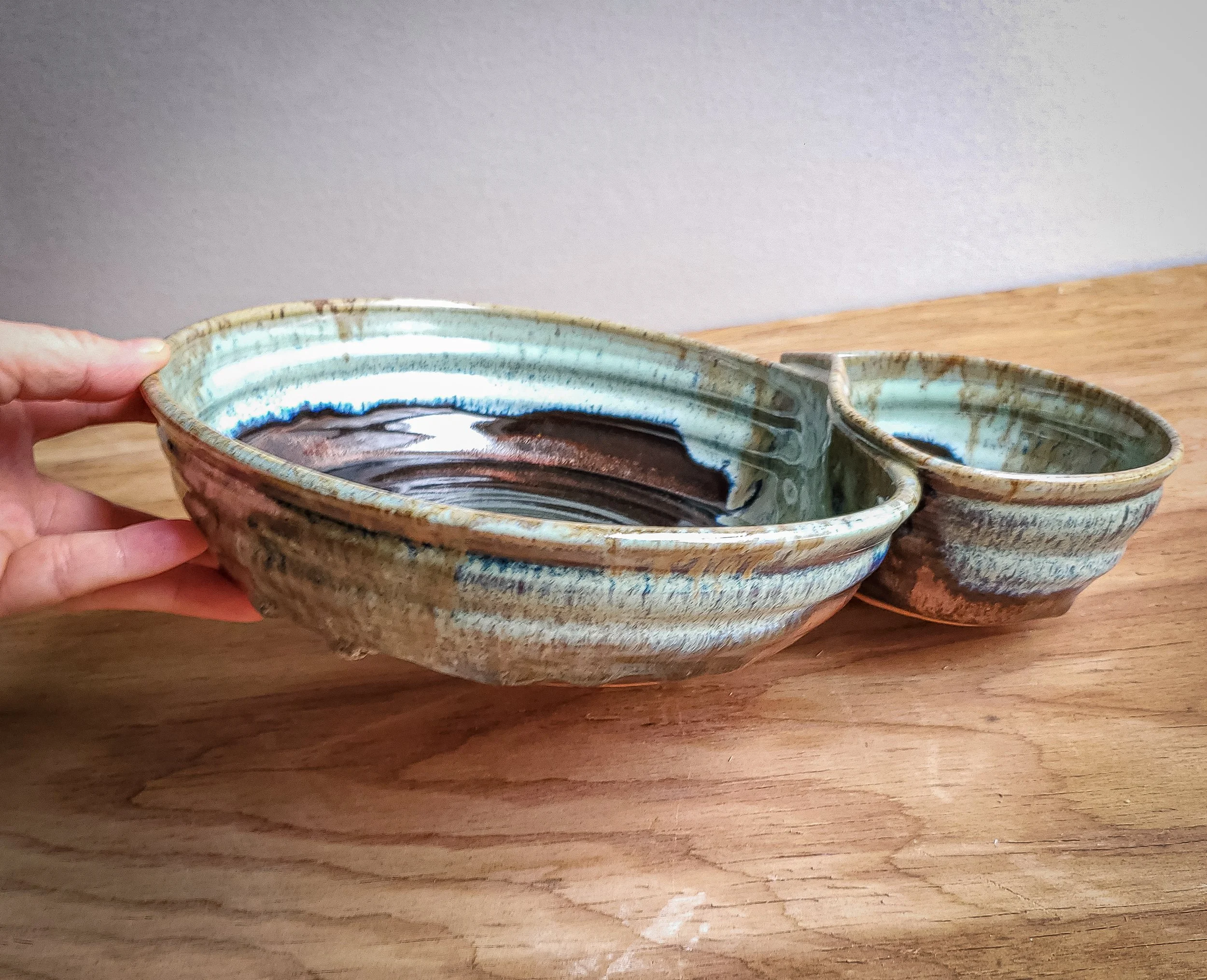 An attached bowl & bowl dip, perfect for dinner parties or a Netflix & chill night! The main bowl is a little over 8 inches wide and the length of the 2 bowls is about 11 inches. The bowls are securely attached together while wet and will not separate.