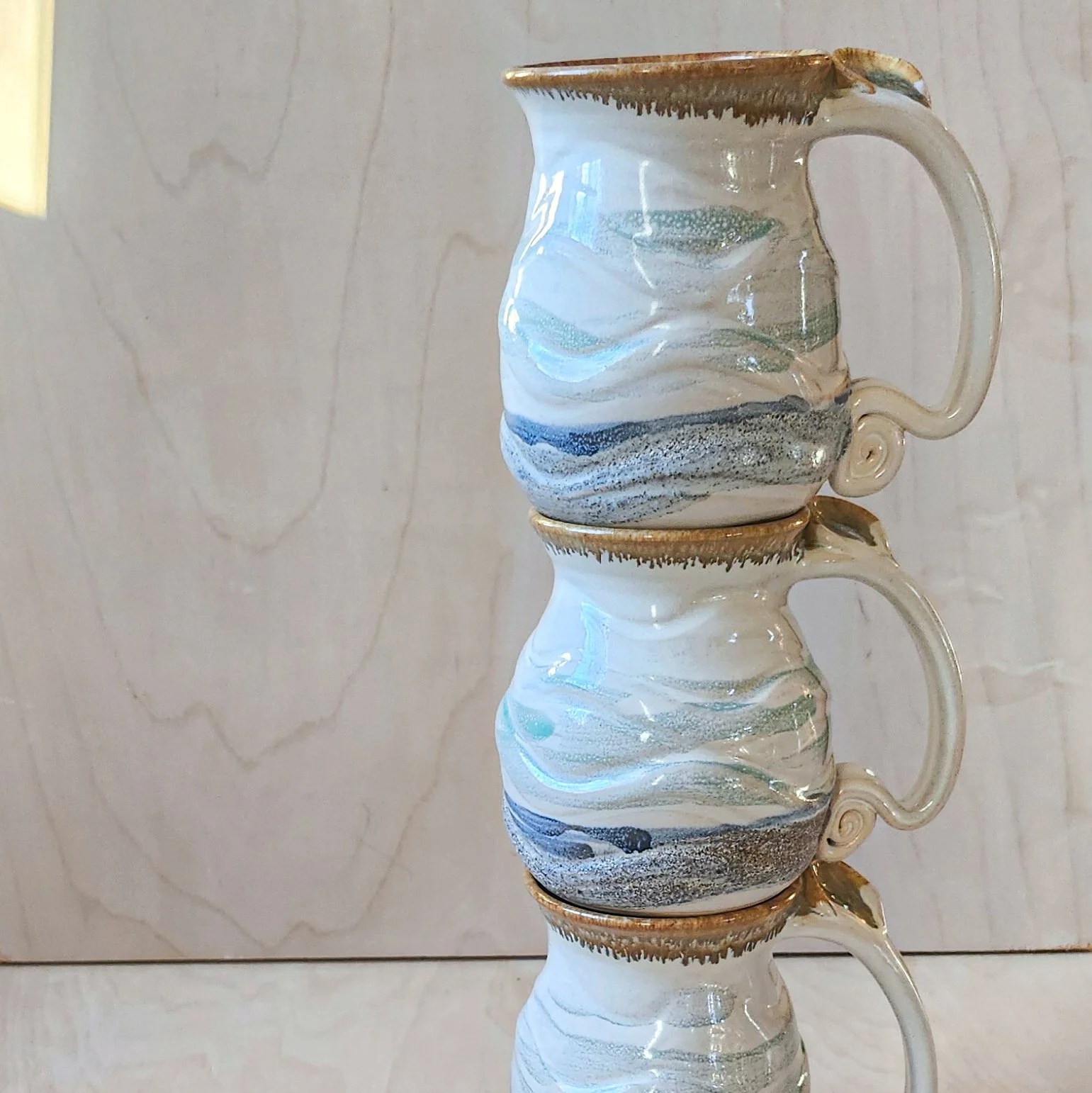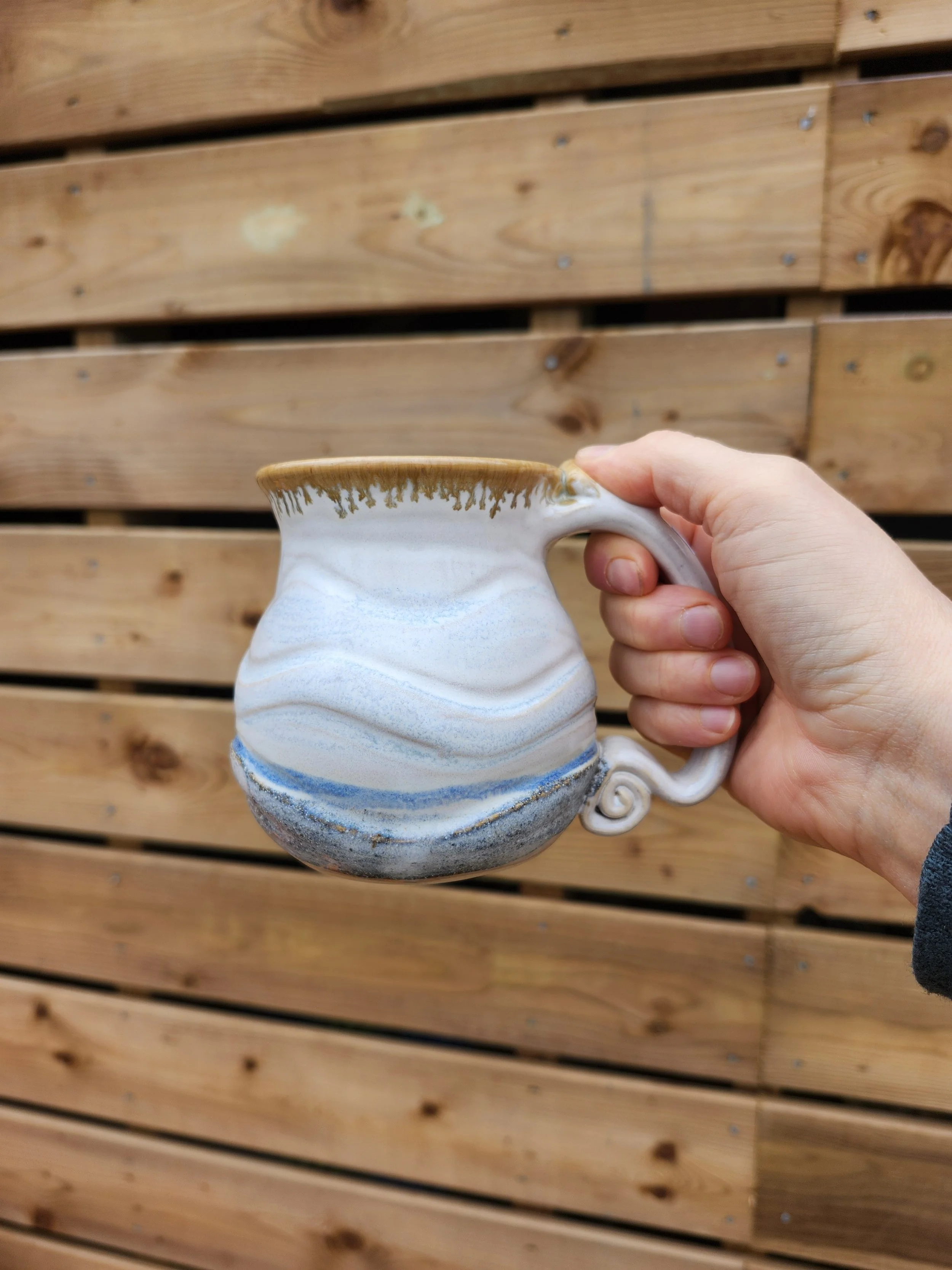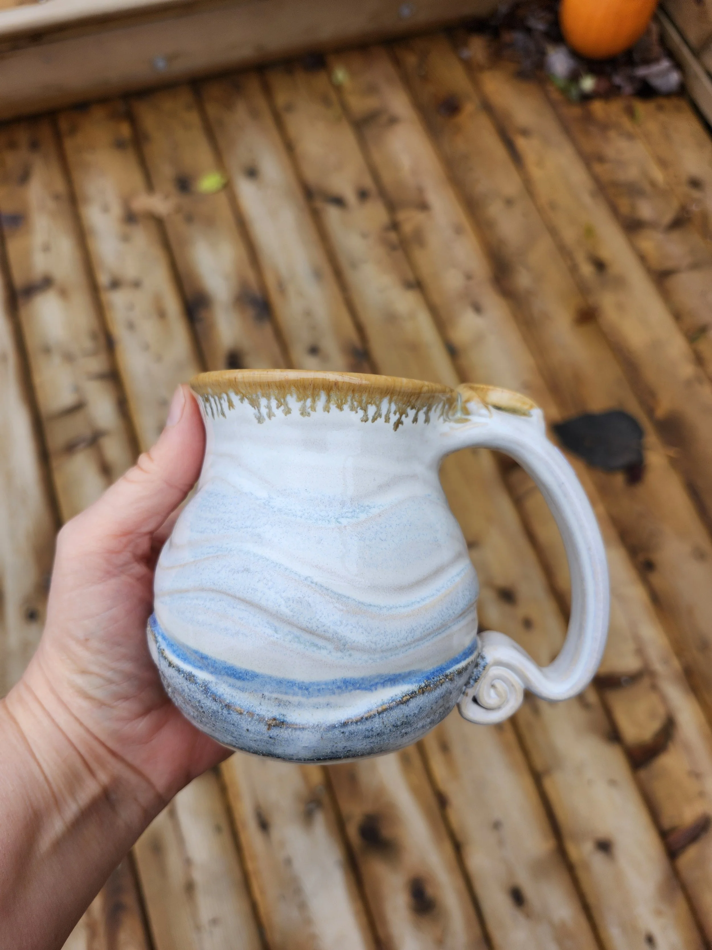 450mls of liquid bliss in a white clay. A right hand thumb rest with a large handle. Sand from Lawrencetown Beach is fused onto the bottom, with faint colors of blue and turquoise above it.