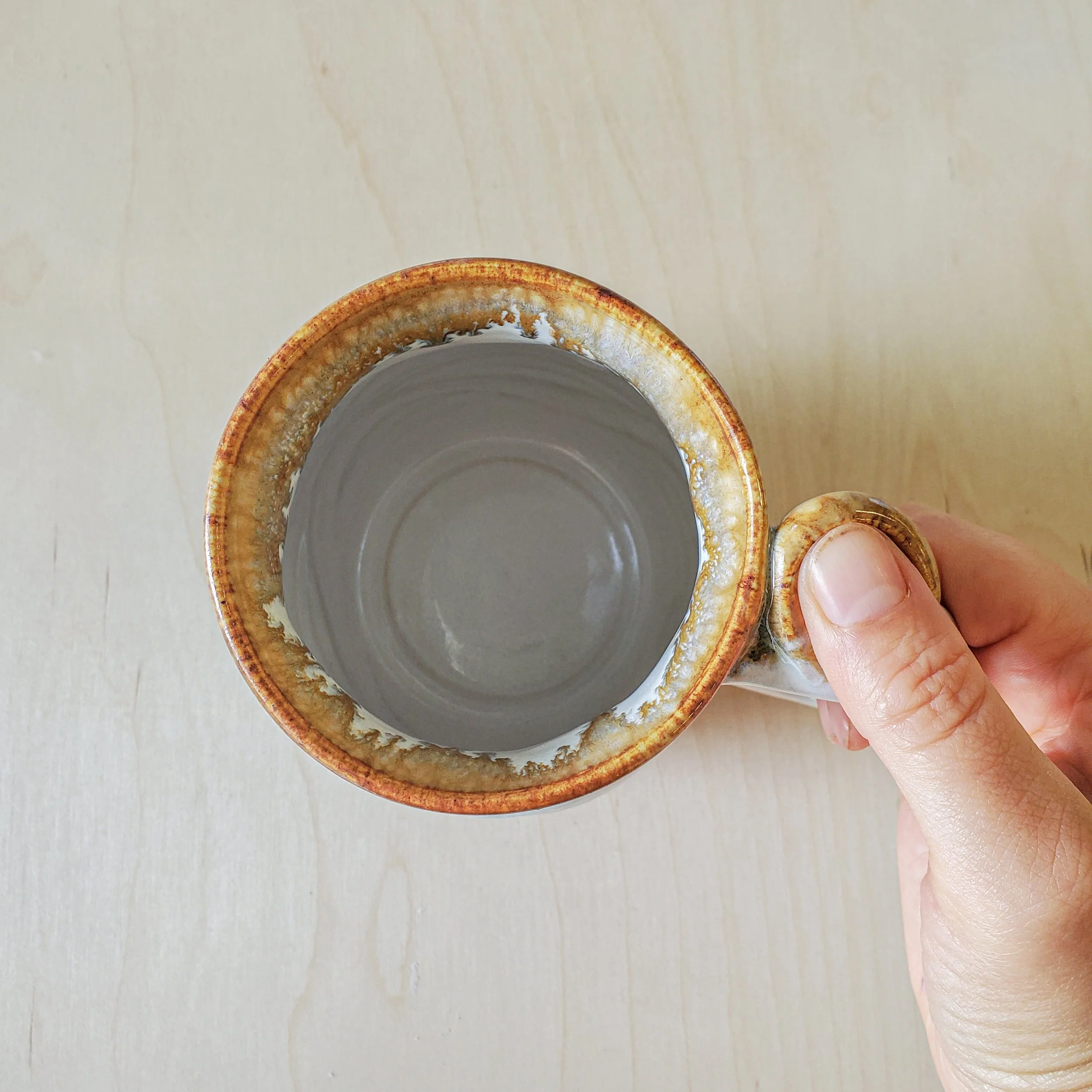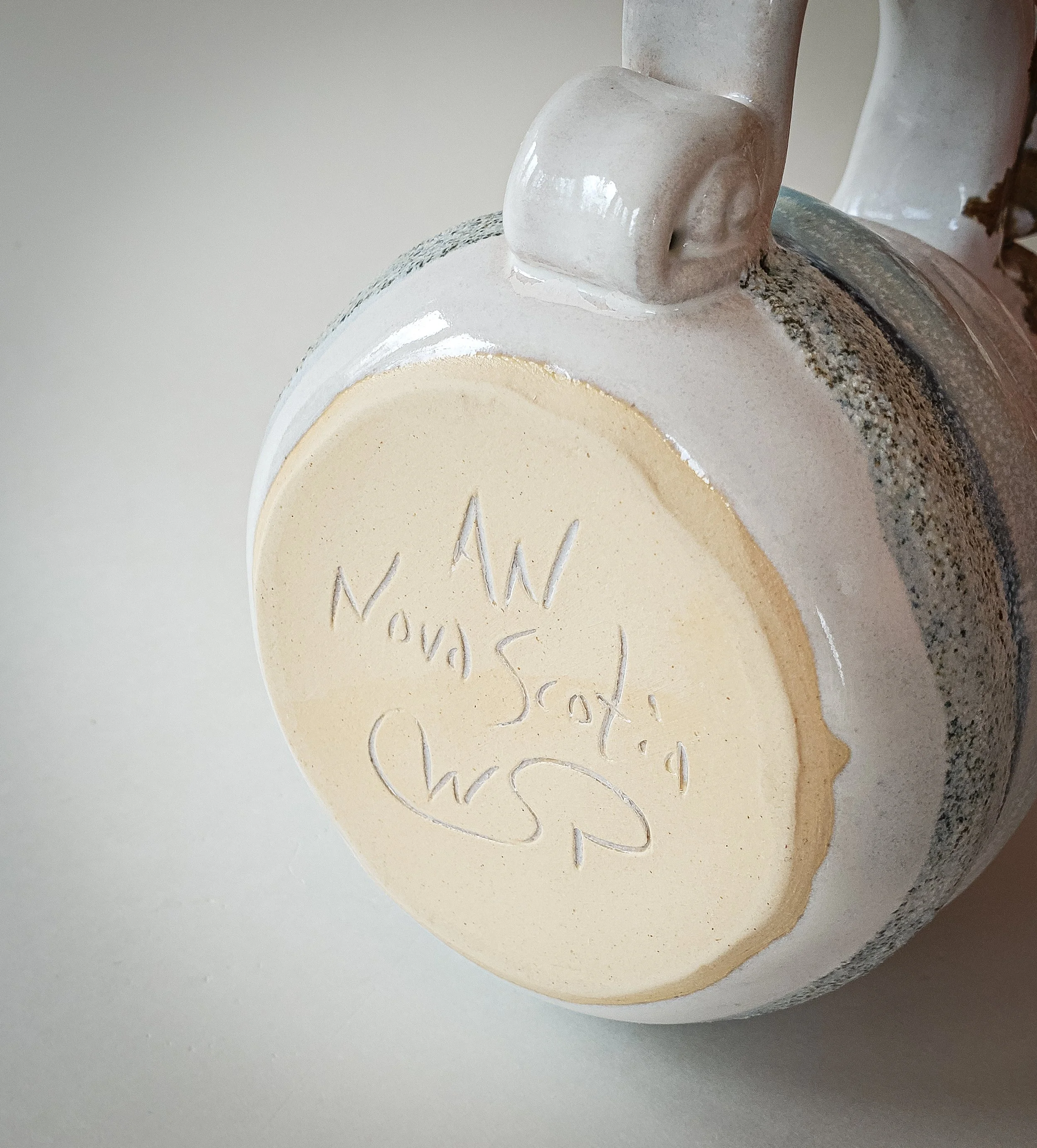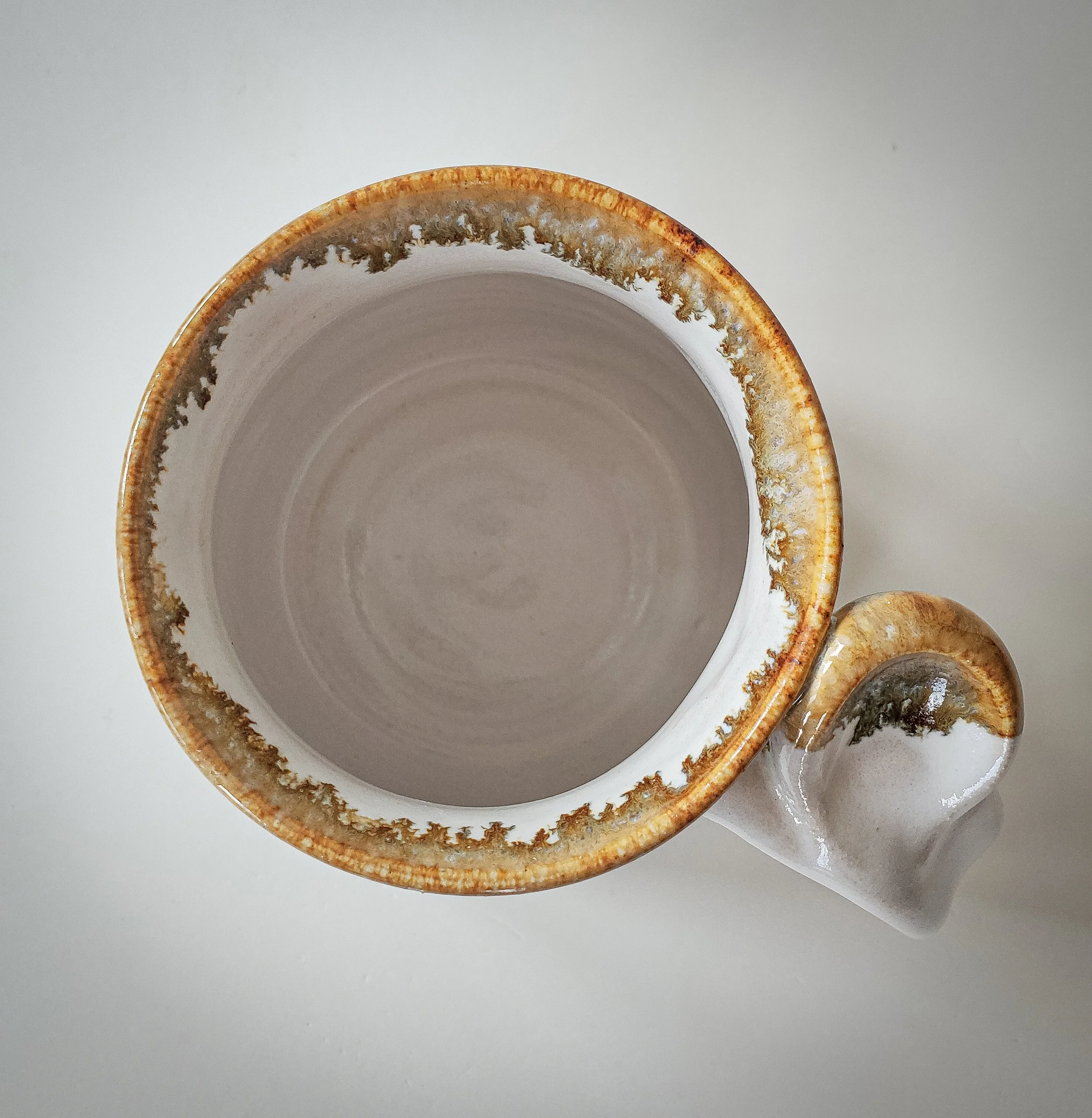 450mls of liquid bliss in a white clay. A right hand thumb rest with a large handle. Sand from Lawrencetown Beach is fused onto the bottom, with faint colors of blue and turquoise above it.