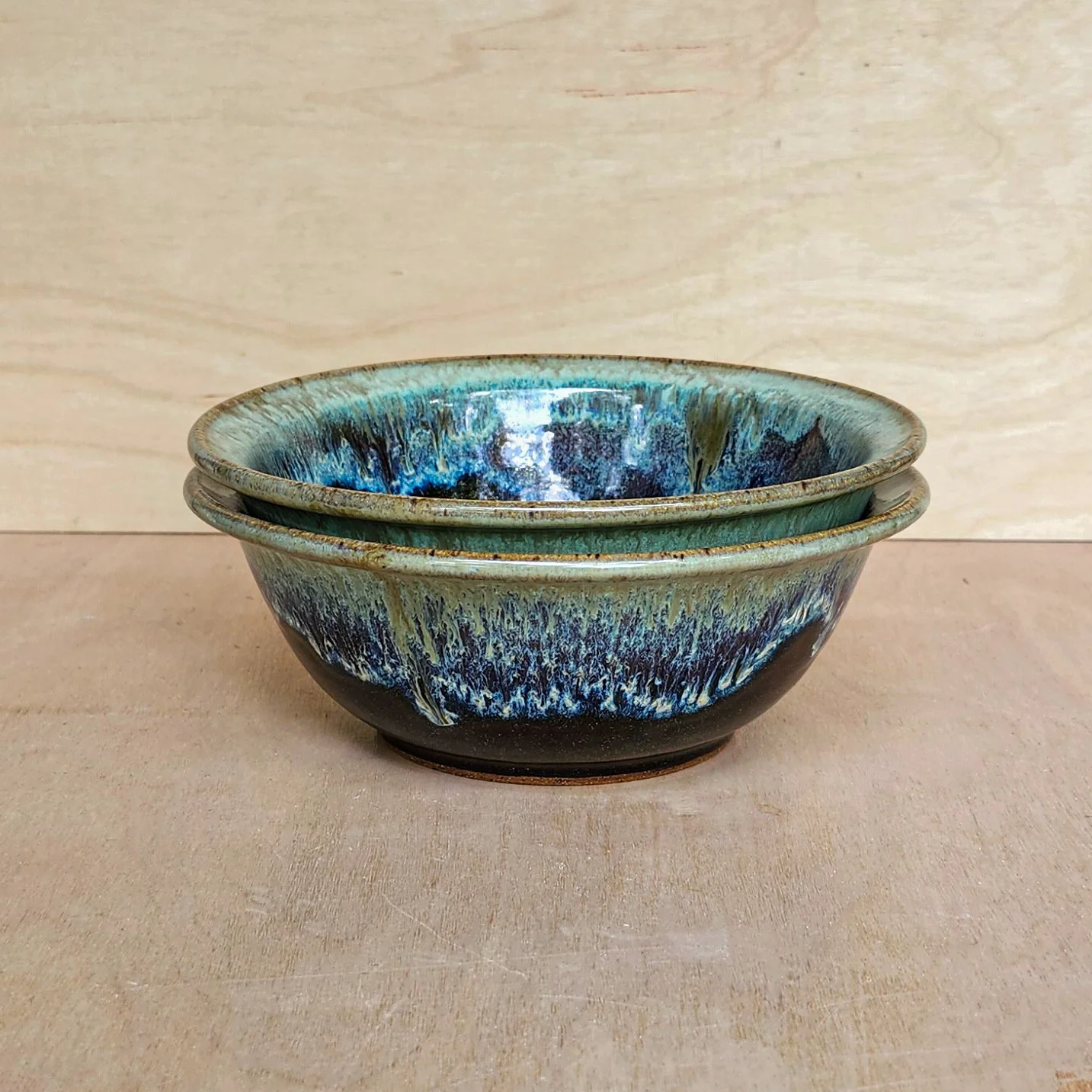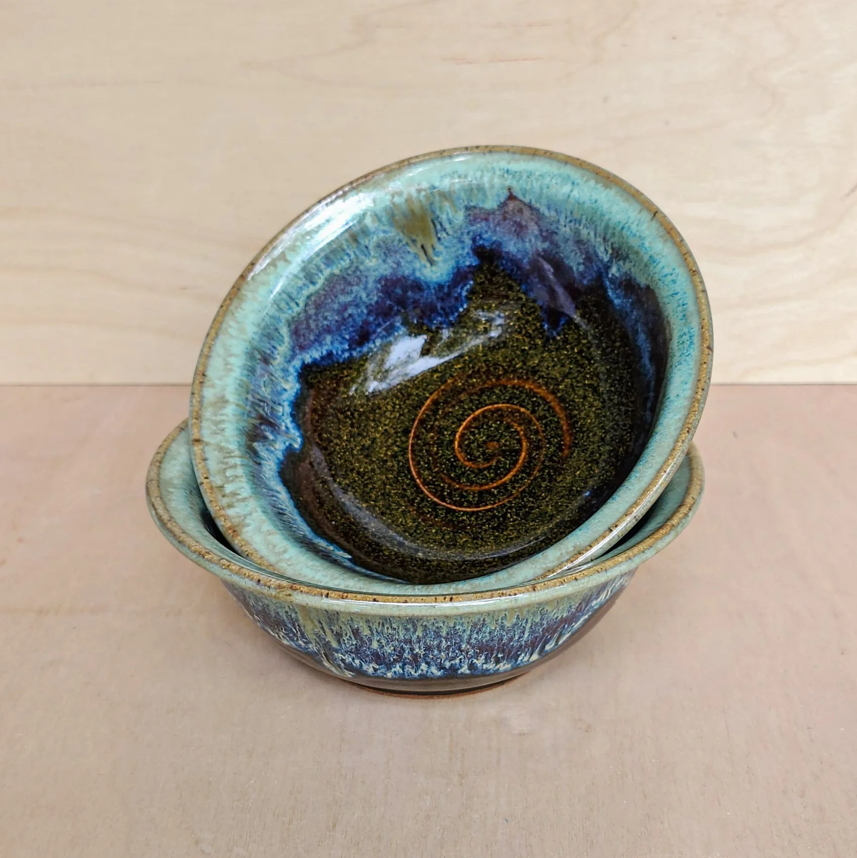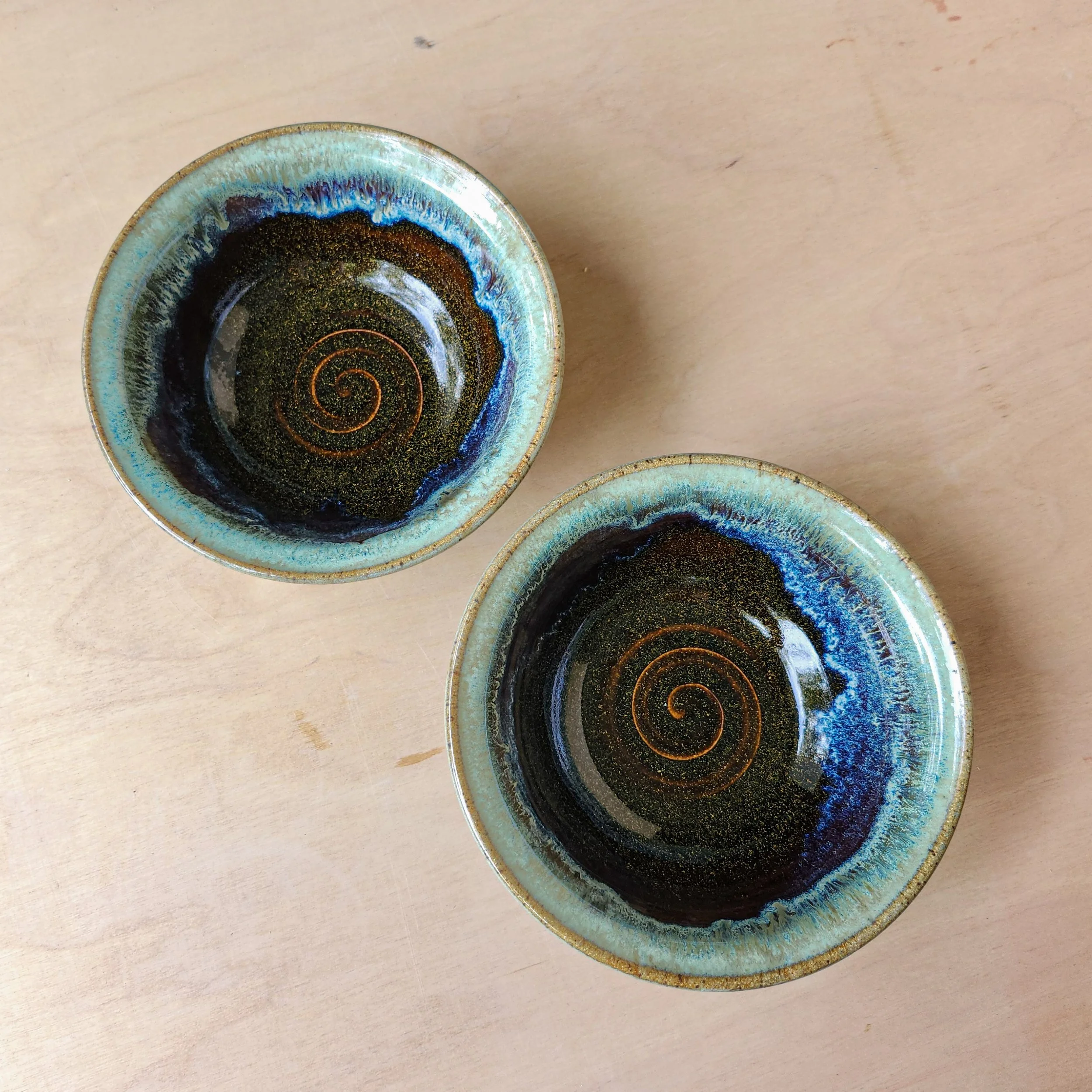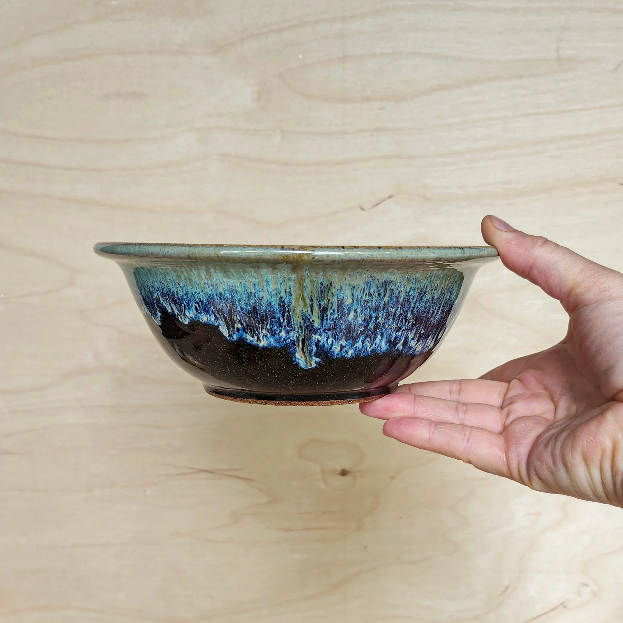 Perfect size for cereal, stews, and chowder. About 6.75 inches wide outside the rim and 2.5 inches high. Dishwasher safe and microwave safe. A brown glaze around the bottom has gold flecksin it. Mint green glaze drips around the top with some hints of bioluminescence in between!