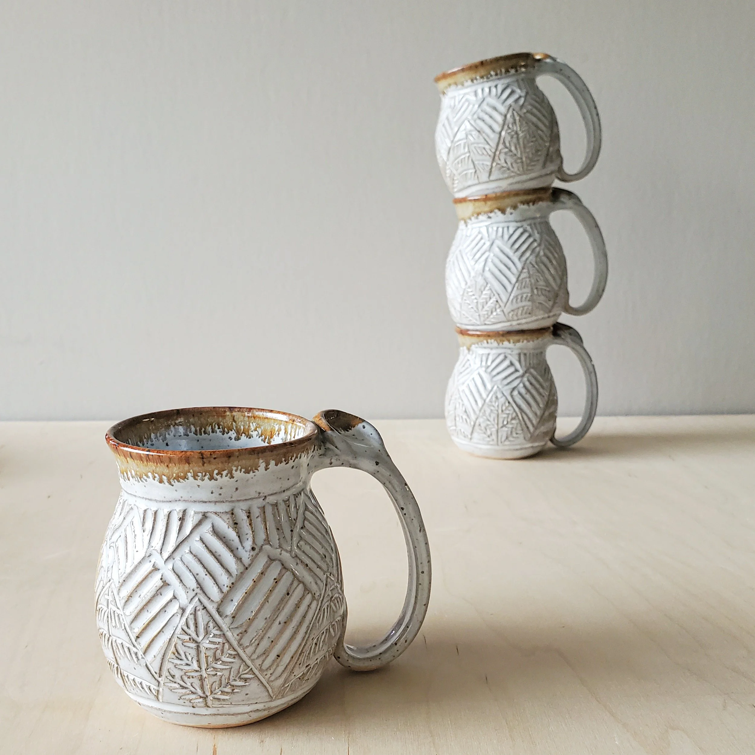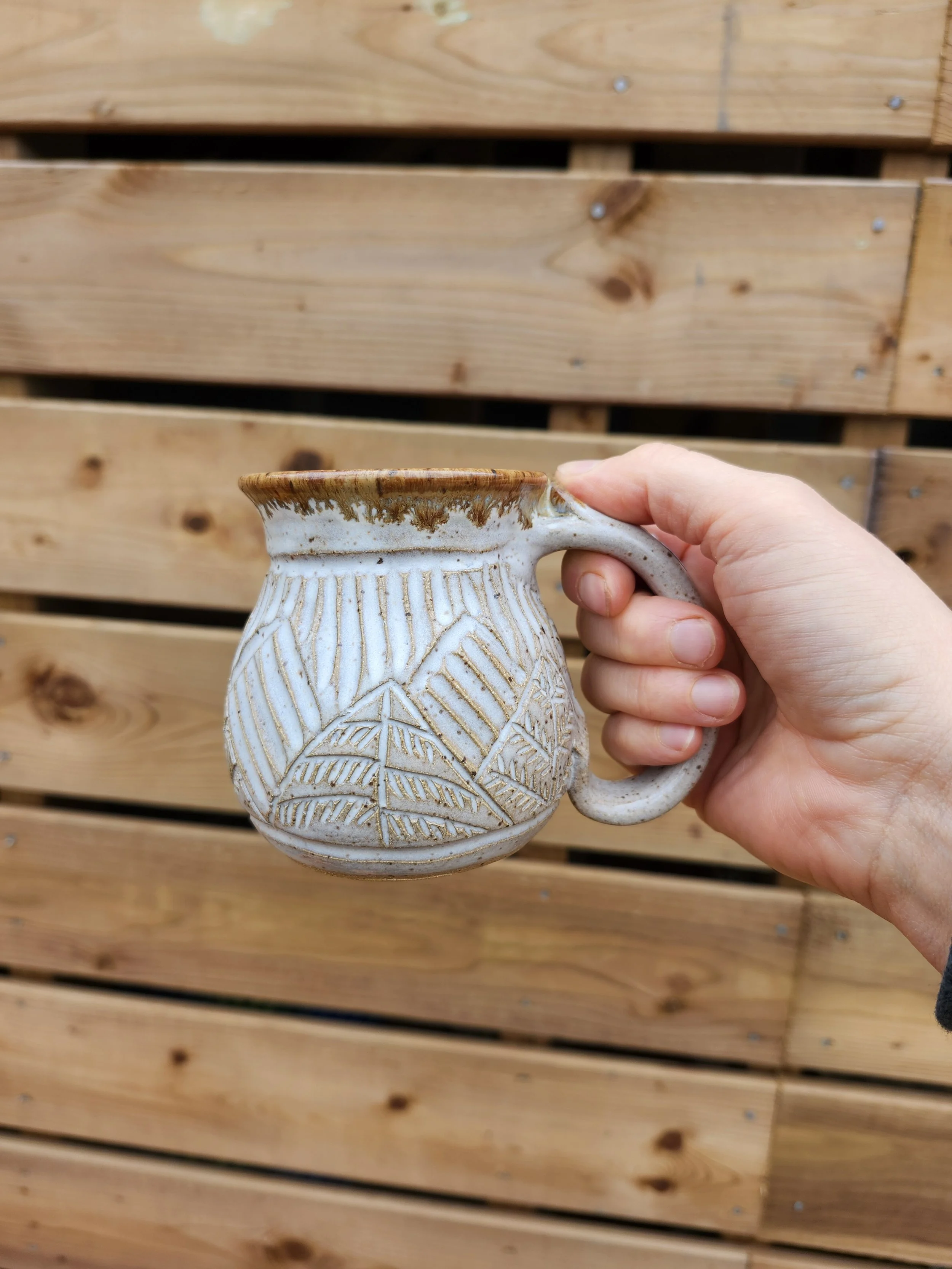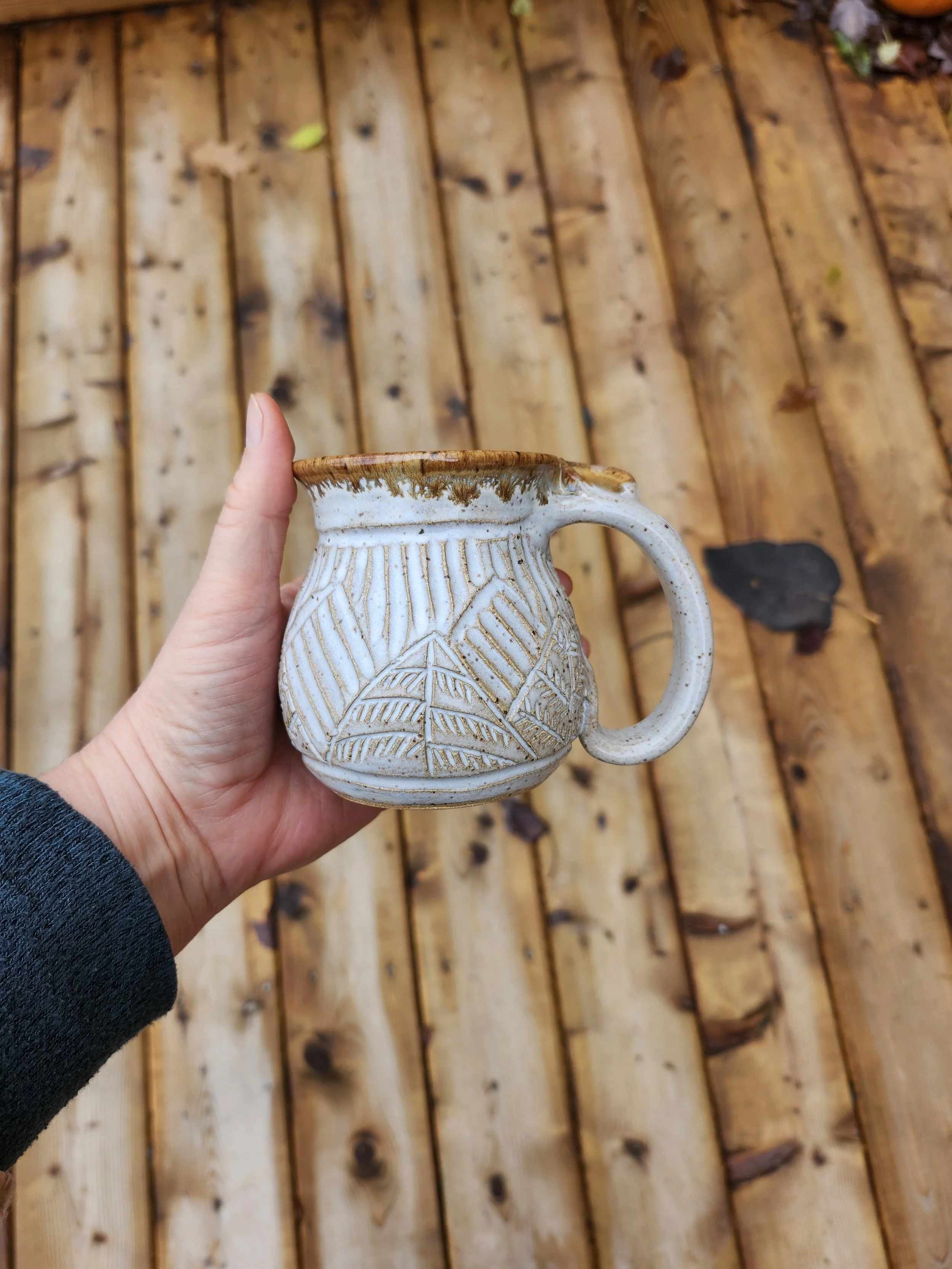 A hand carved mug holding about 350mls of liquid bliss. A right hand thumb rest. Carved tree and mountain shapes add satisfying textures around the whole mug.