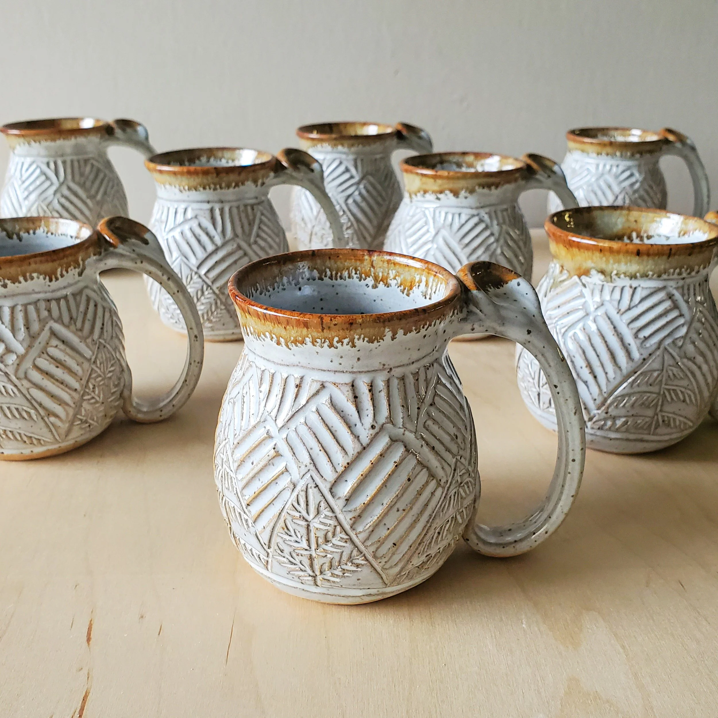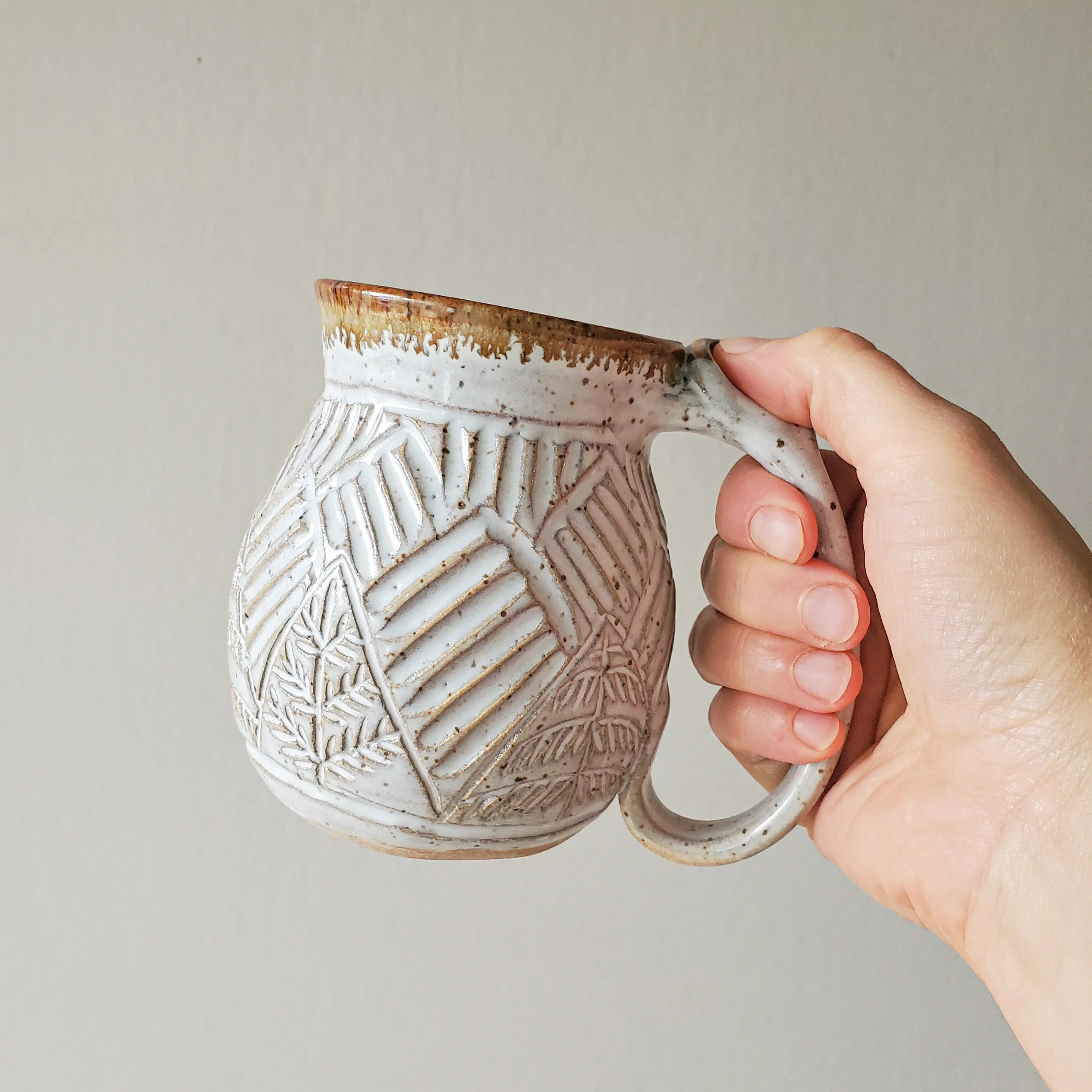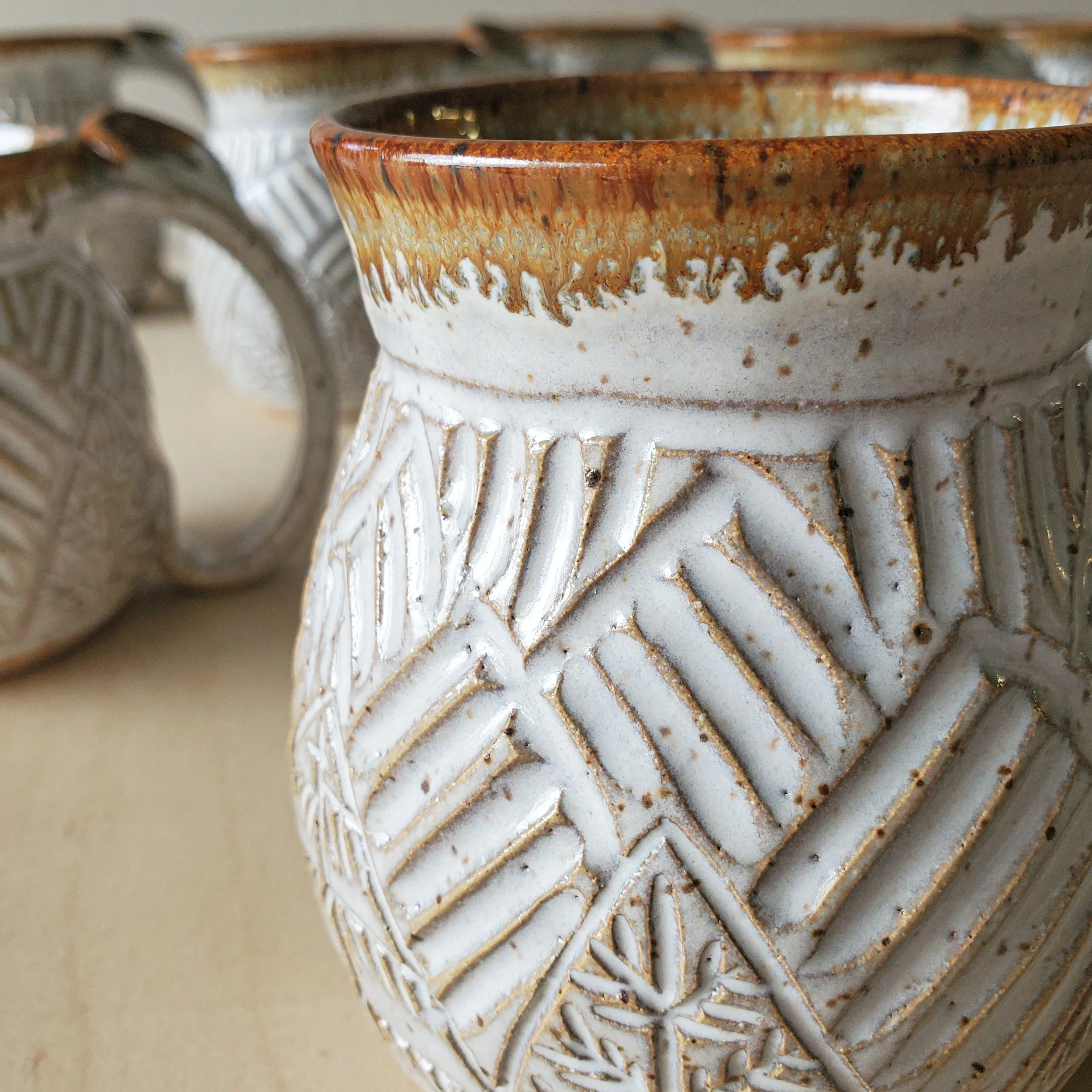 A hand carved mug holding about 350mls of liquid bliss. A right hand thumb rest. Carved tree and mountain shapes add satisfying textures around the whole mug.